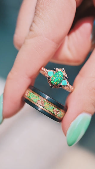 The matching men’s band radiates power and sophistication. Crafted from two-tone tungsten carbide, it features a vivid crushed Green Fire Opal inlay accented with rose gold leaf details. The result is a bold, modern design that mirrors strength, balance, and eternal loyalty.