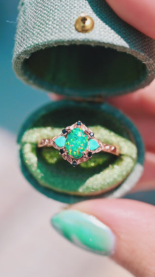 A masterpiece of artistry and emotion, her ring features a luminous oval-cut Green Fire Opal — shimmering with hints of green, blue, and gold — framed by opalescent blue sapphire and black onyx side stones. Set in 925 solid sterling silver with a 14K rose gold finish, this ring exudes sophistication, fantasy flair, and modern elegance.