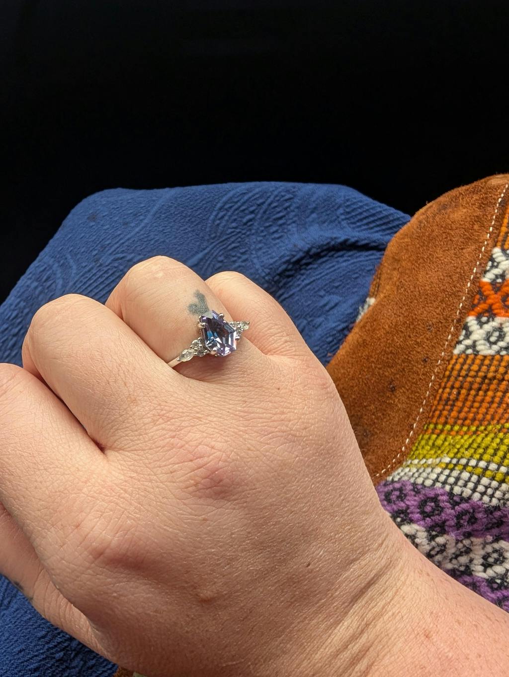 This ring is absolutely gorgeous and so well made. Pictures don’t even come close to doing alexandrite justice! The color shifts from teal to purple depending on the light source. The unique coffin cut makes it stand out even more, and I’m obsessed with how it looks on my hand. I couldn’t be happier with it! Honestly, when my bf is ready to propose, I already know I want a white gold rjng from Aquamarise!