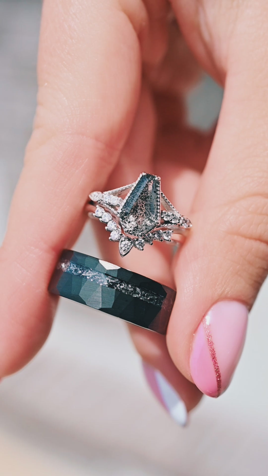 ►Paired with a complementary bridal ring, this set is a harmonious union of the old and the new, the refined and the raw. The Art Deco Galaxy Raw Salt and Pepper Diamond Ring is not merely a symbol of commitment; it is a wearable work of art that transcends time, capturing the essence of a love that is as unique and enduring as the stars in the night sky. Celebrate your love story with this exceptional engagement ring set, where sophistication meets celestial beauty in perfect harmony.