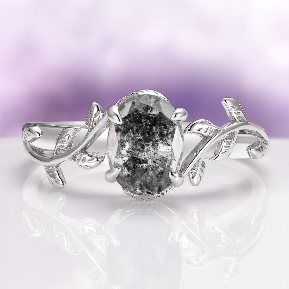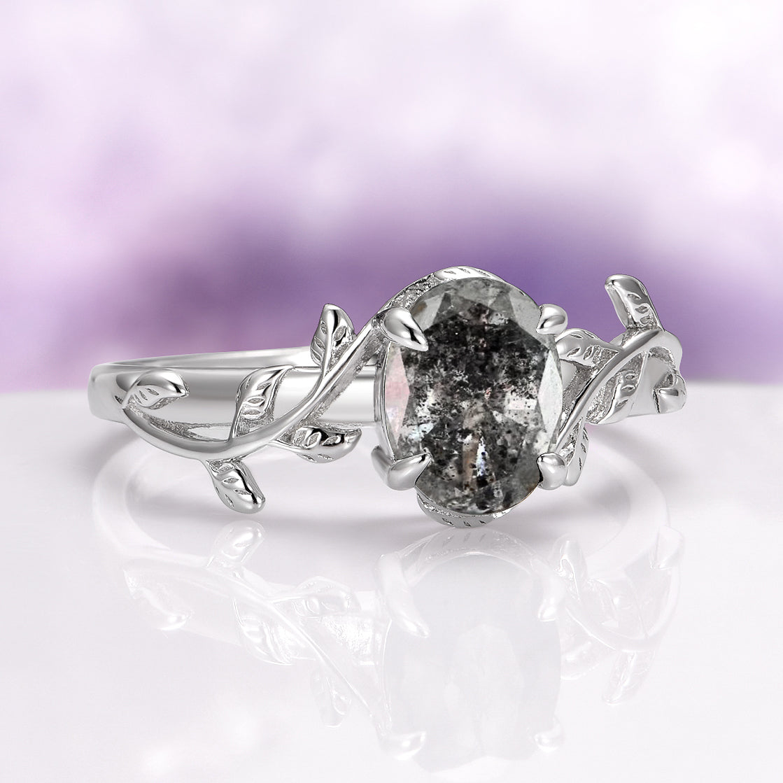 Make a celestial statement with this Galaxy Raw Salt and Pepper Diamond Engagement Ring, featuring a natural Herkimer diamond set in solid 925 sterling silver. With its ethereal sparkle and organic inclusions, this oval-cut gemstone captures the beauty of the cosmos. Each ring is one-of-a-kind—perfect for those who prefer jewelry that tells a story of nature, time, and artistry.