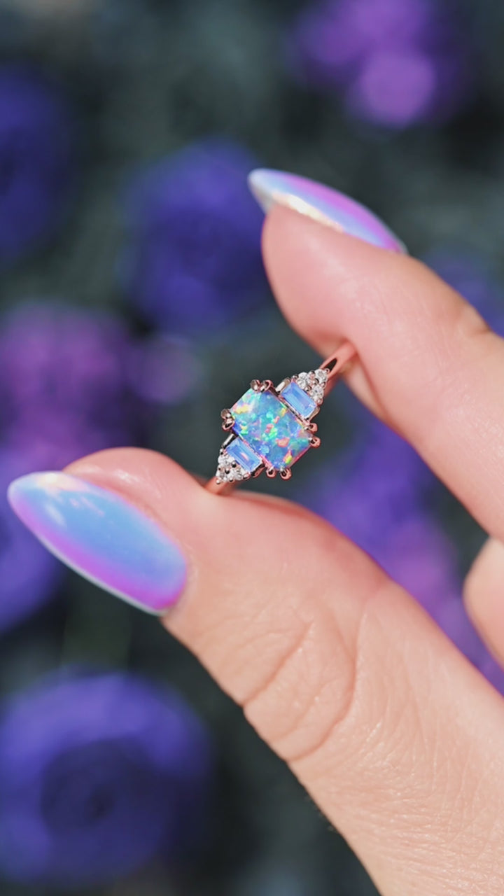 Light Blue Fire Opal & Opalescent Sapphire Engagement Ring in 14k Rose Gold Vermeil