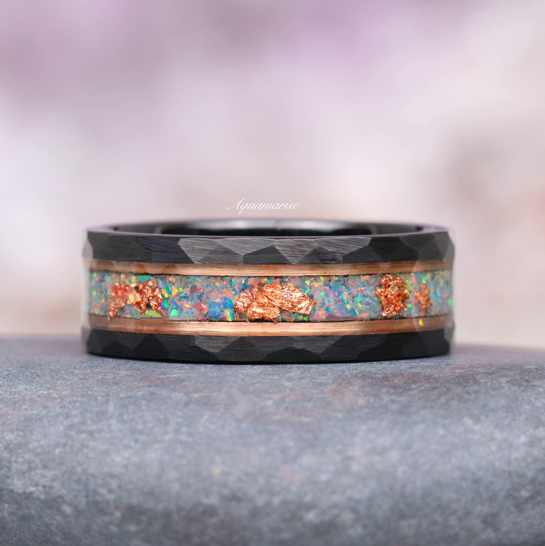 *Metal type: two-tone tungsten carbide with crushed blue fire opal and rose gold leaf inlay.