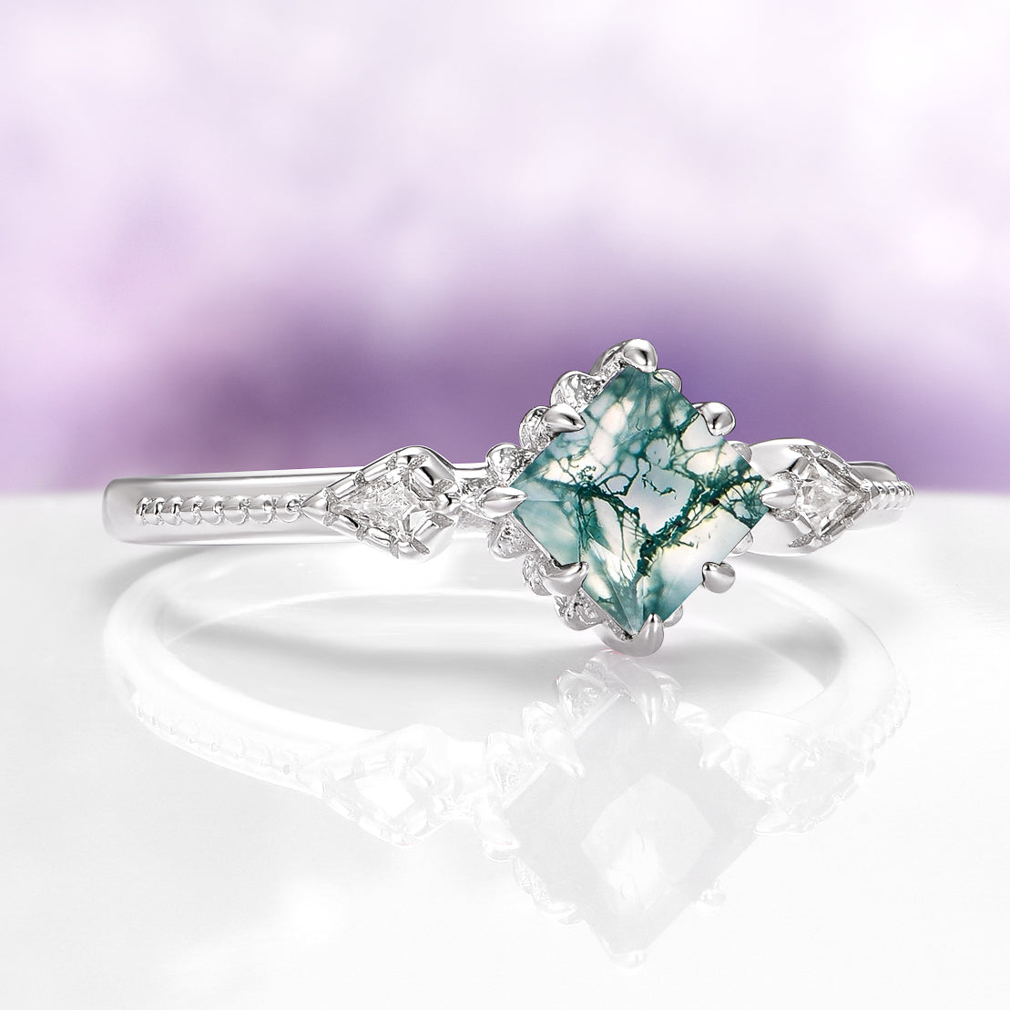 The princess-cut natural moss agate is perfectly complemented by the minimalist silver setting, making this ring ideal as an engagement ring set, promise ring, or statement piece for everyday wear. Each ring is one-of-a-kind, featuring organic inclusions that make every stone completely unique.