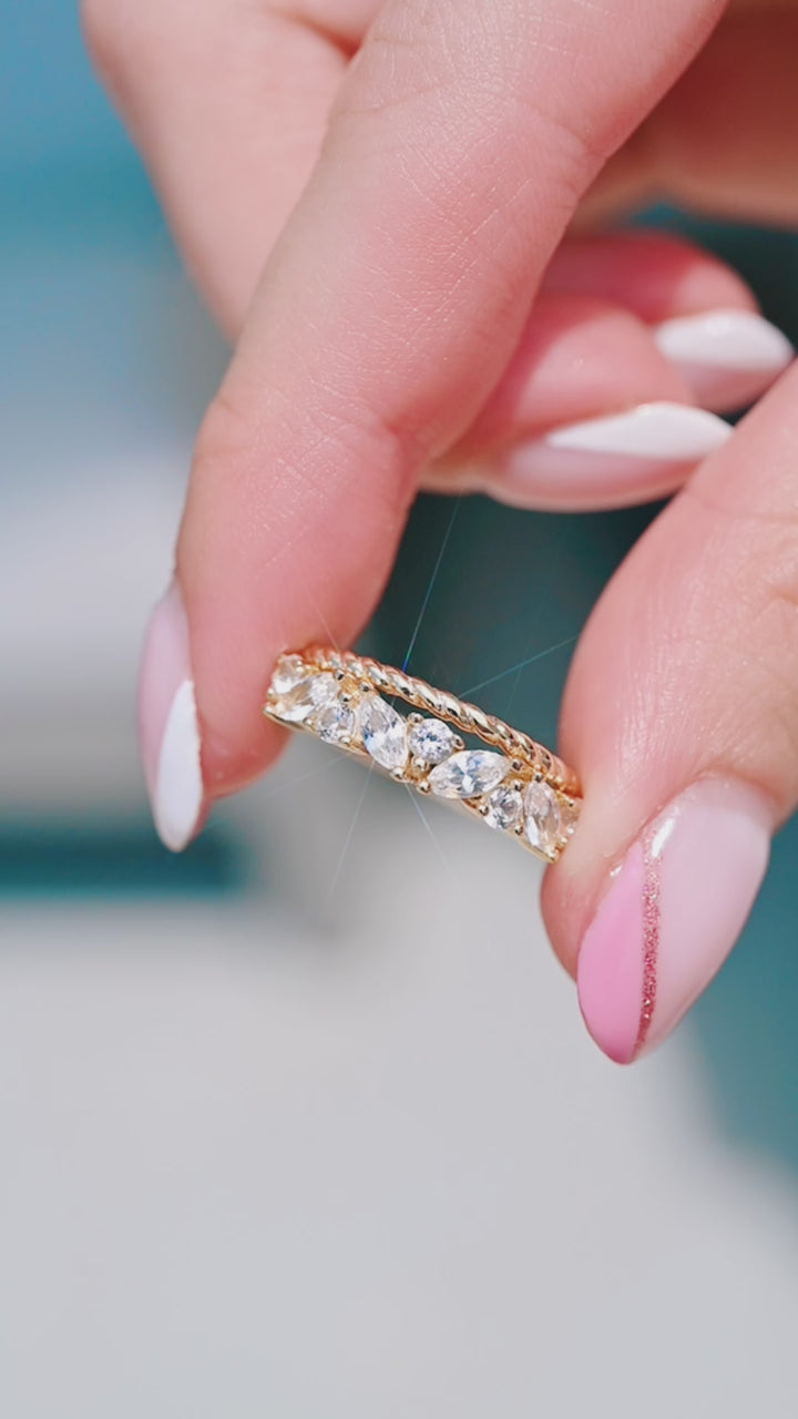 Beautiful ring set. Stones sparkle. Gold shines. Great addition to my wedding ring stack.
