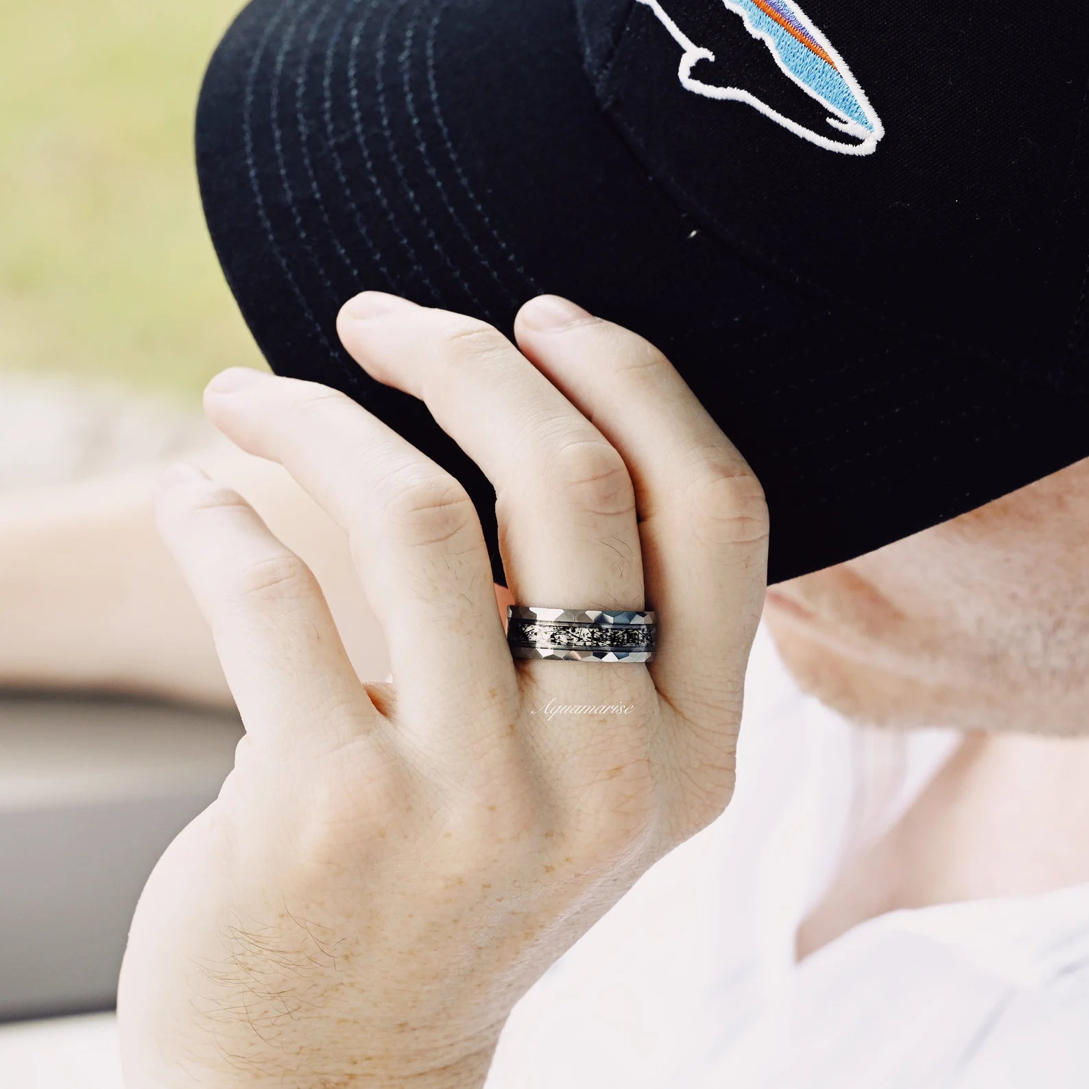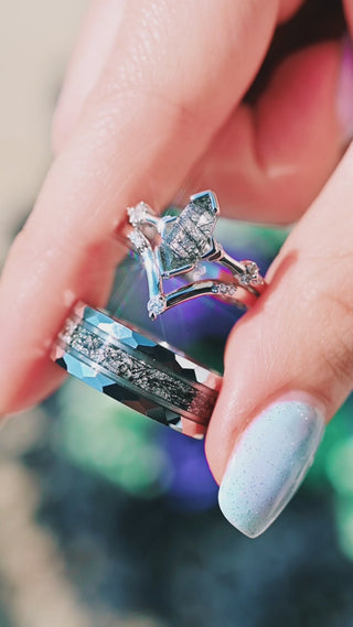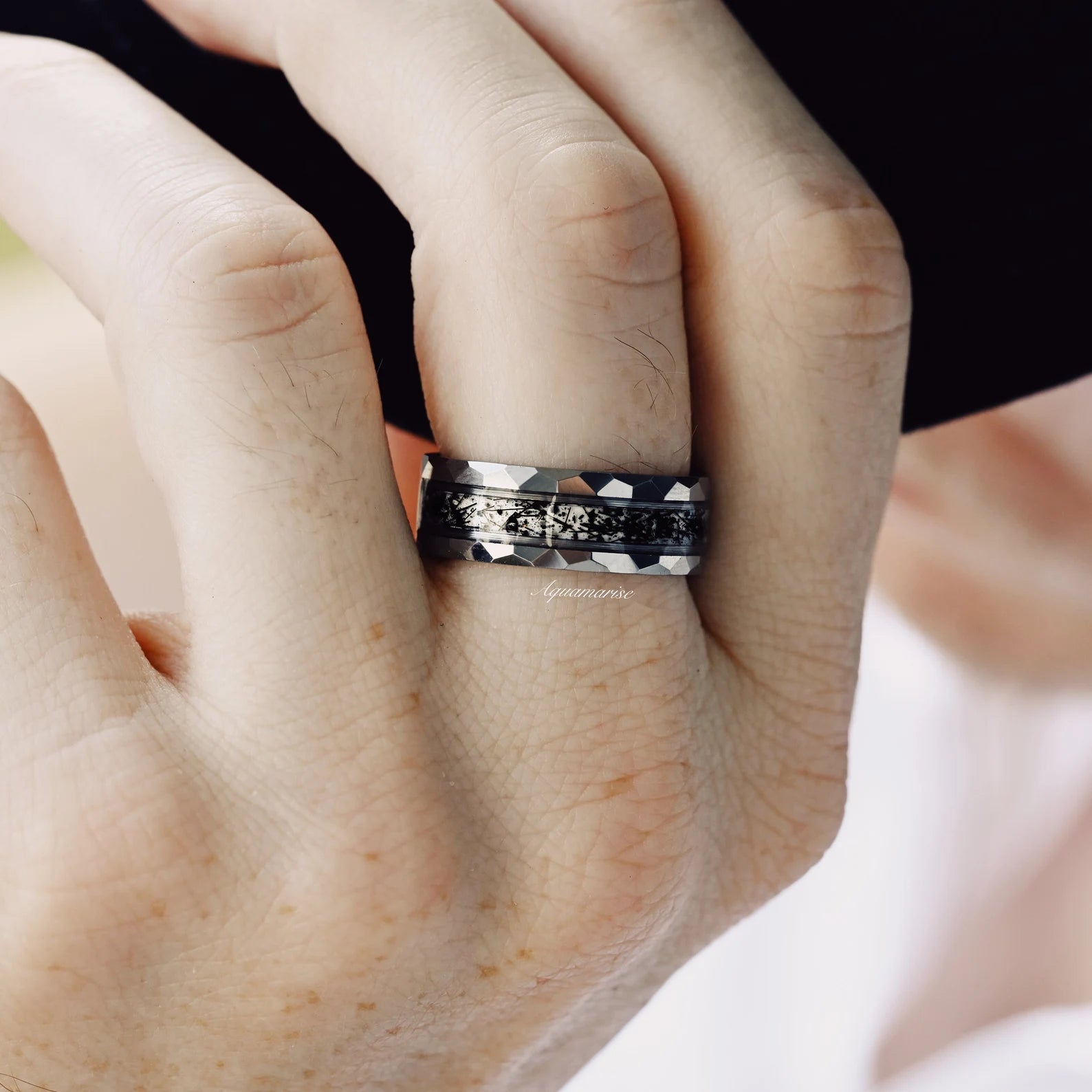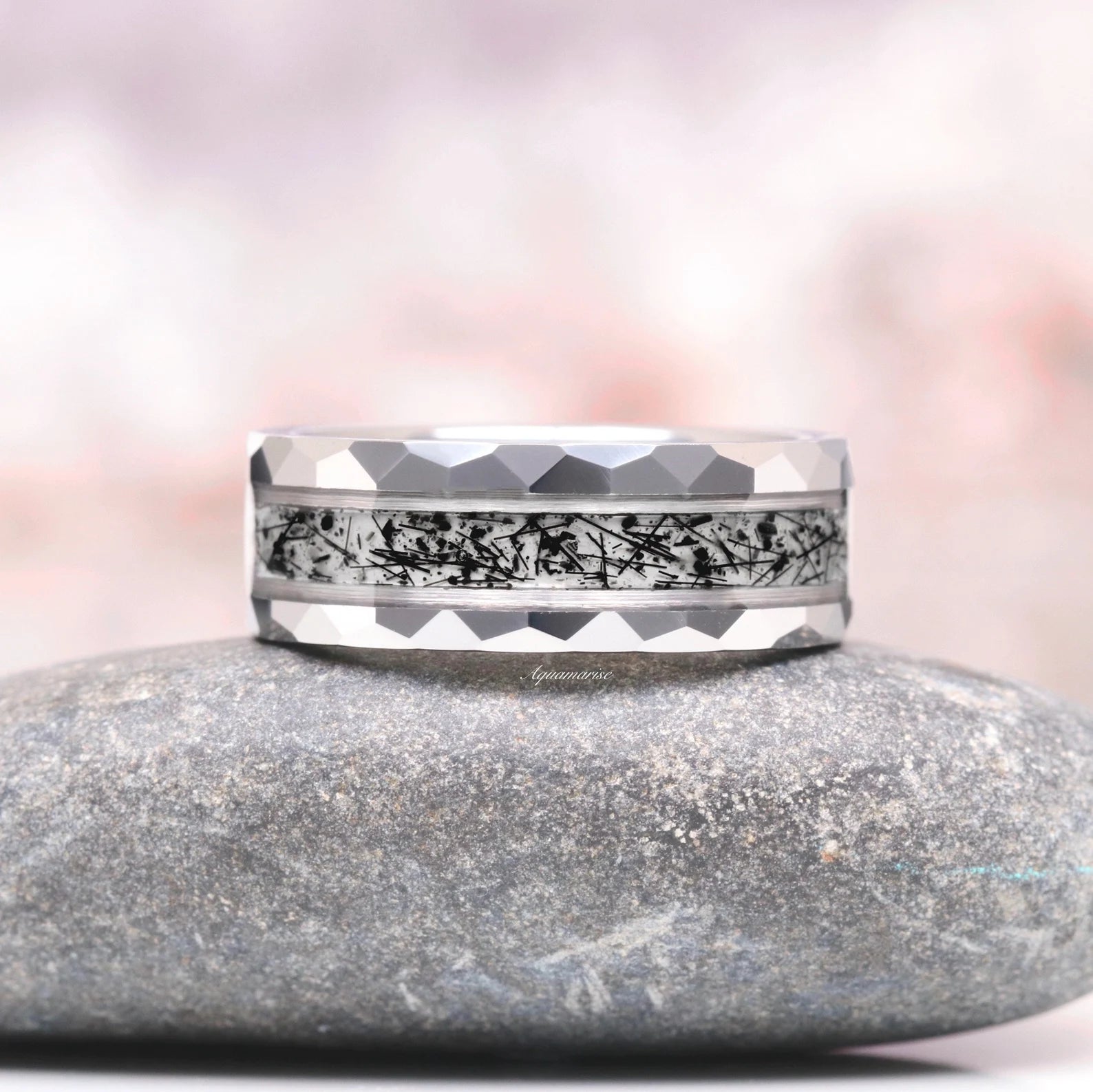 ►His ring is Polished and Hammered Tungsten Carbide with Crushed Rutilated Quartz