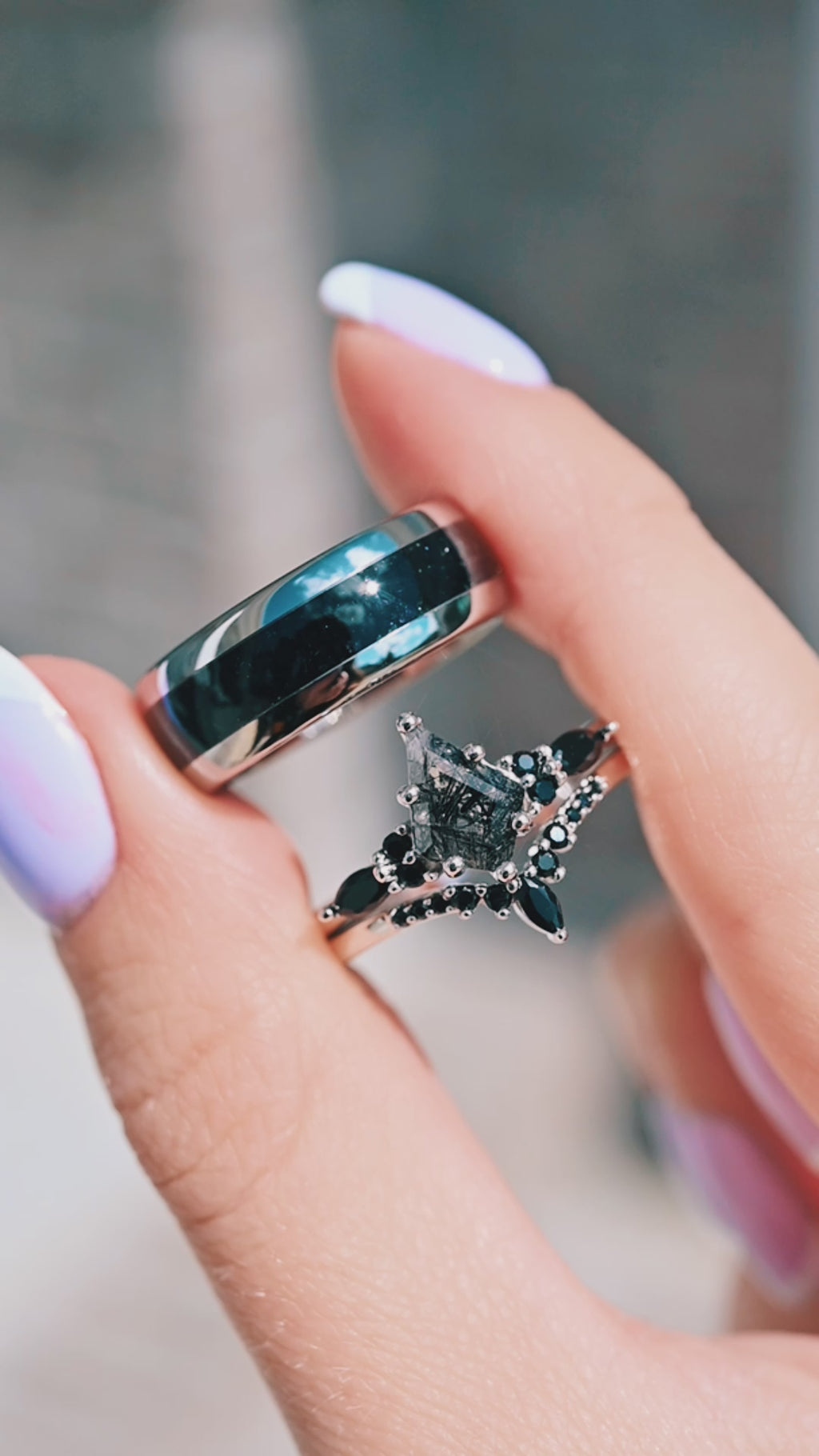 Skye Kite Cut Natural Rutilated Quartz & Black Onyx Skye Ring Set, a stunning embodiment of timeless elegance and shared love. Crafted with meticulous attention to detail, this enchanting ring set is a symbol of connection, harmony, and the unique bond between two individuals.