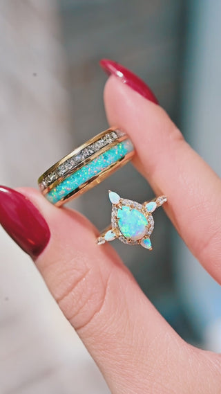 Celebrate your love with the Blue Fire Opal & Crushed Diamond Couples Ring Set. This exquisite collection includes matching wedding bands designed to symbolize your enduring bond. The set features stunning blue fire opals that radiate with vibrant, mesmerizing hues, complemented by the sparkle of crushed diamonds. The rings are crafted in luxurious 14K yellow gold vermeil for a timeless elegance and tungsten for its unmatched durability. Perfect as his and hers wedding bands or matching promise rings, this set captures the essence of your unique connection with its blend of beauty and strength.