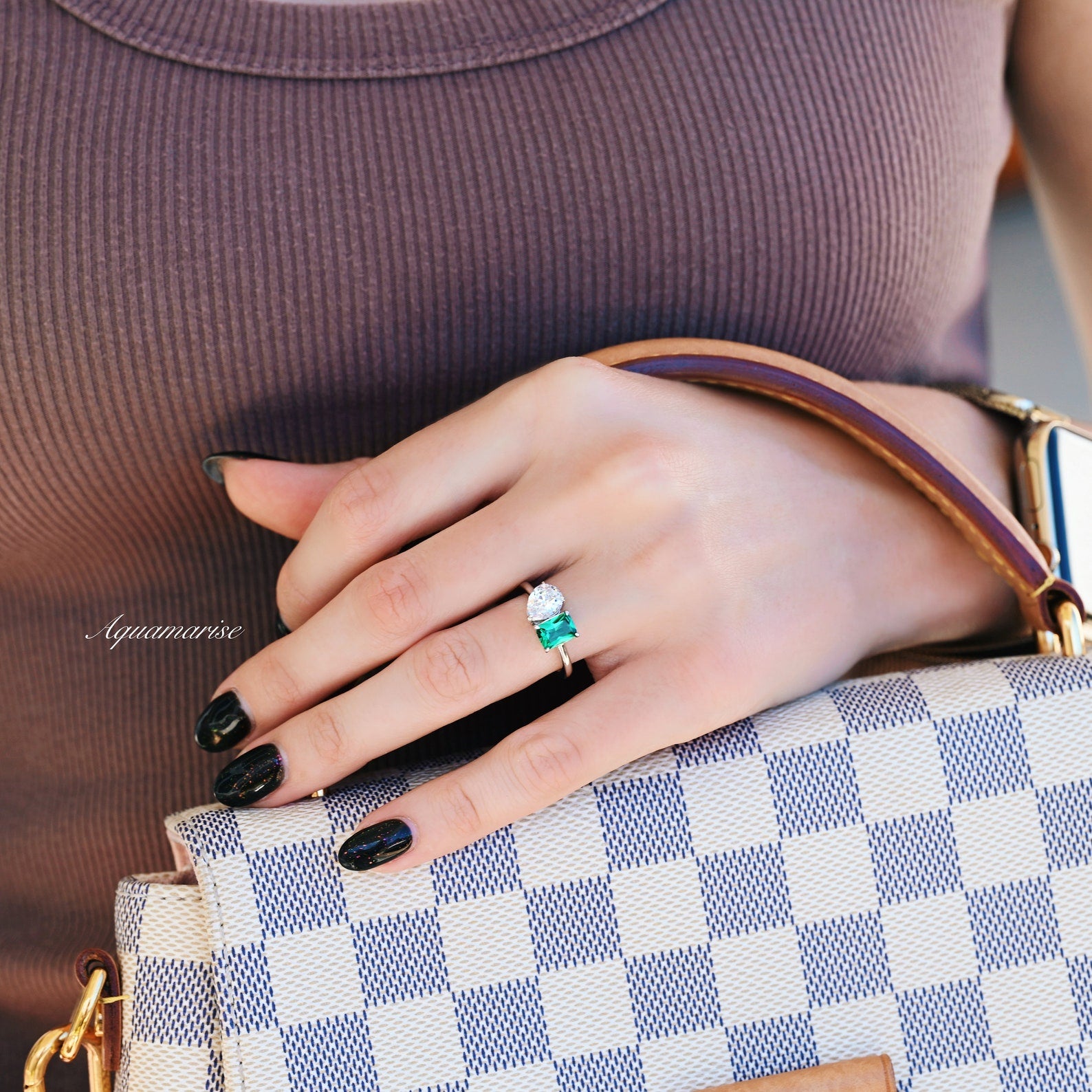 'Toi Et Moi' Minimalist Emerald & Diamond (cz) Ring- 925 Sterling Silver