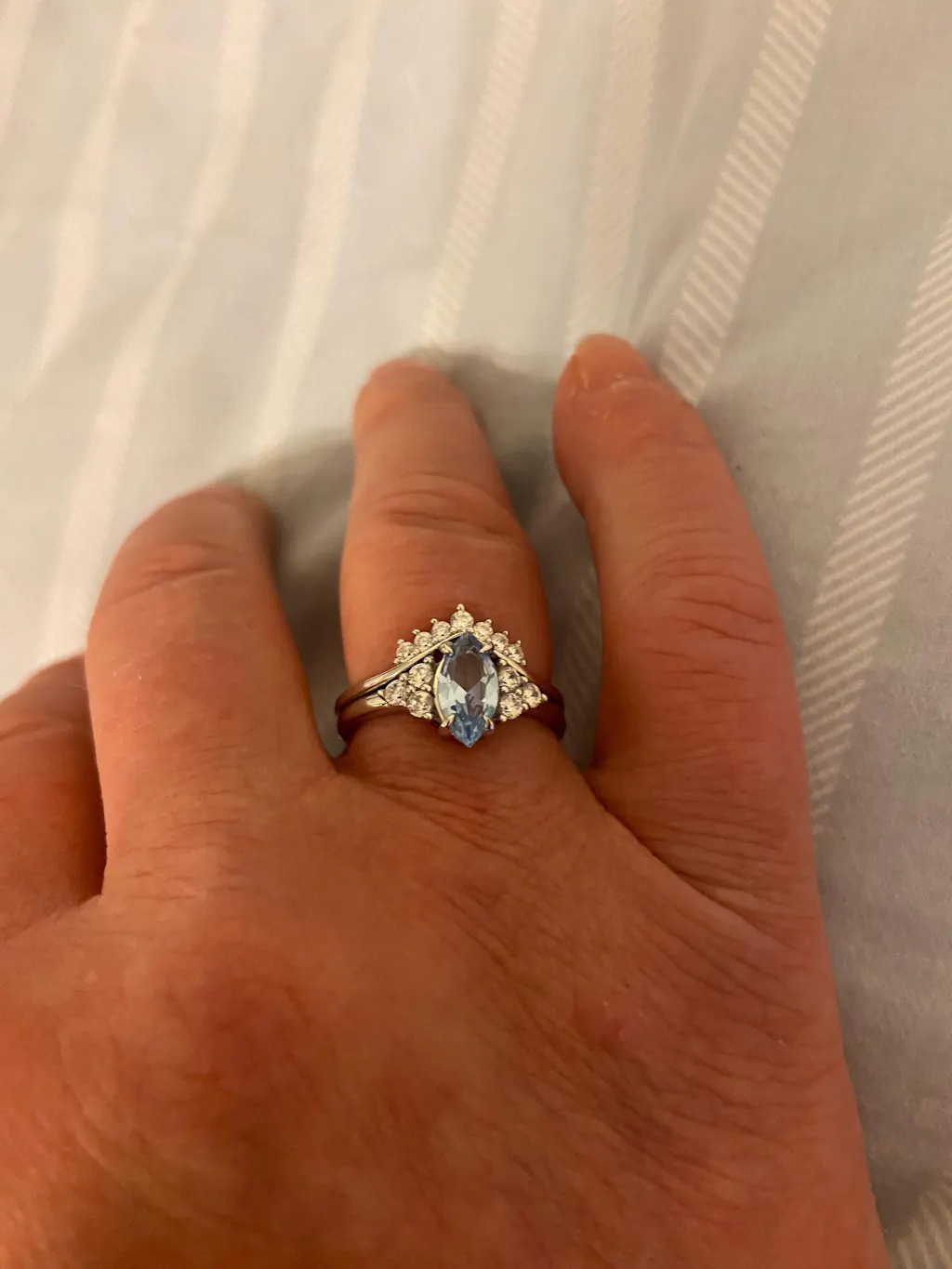 Wow! This ring is beautiful! Superb craftsmanship, aqua gem has great color and perfect marquise cut and size. Simple setting that compliments the Aqua gem. This is my birthstone and I’m a finicky gem hog and finally found my go-to jeweler for price, quality and craftsmanship. This is my 4th Aqua ring purchase from this jeweler and super happy!