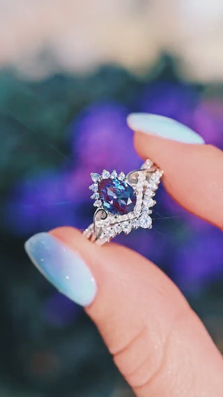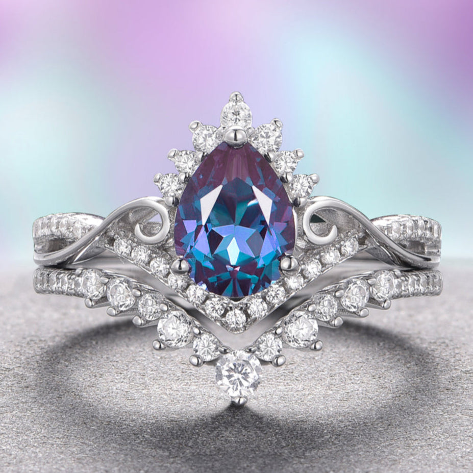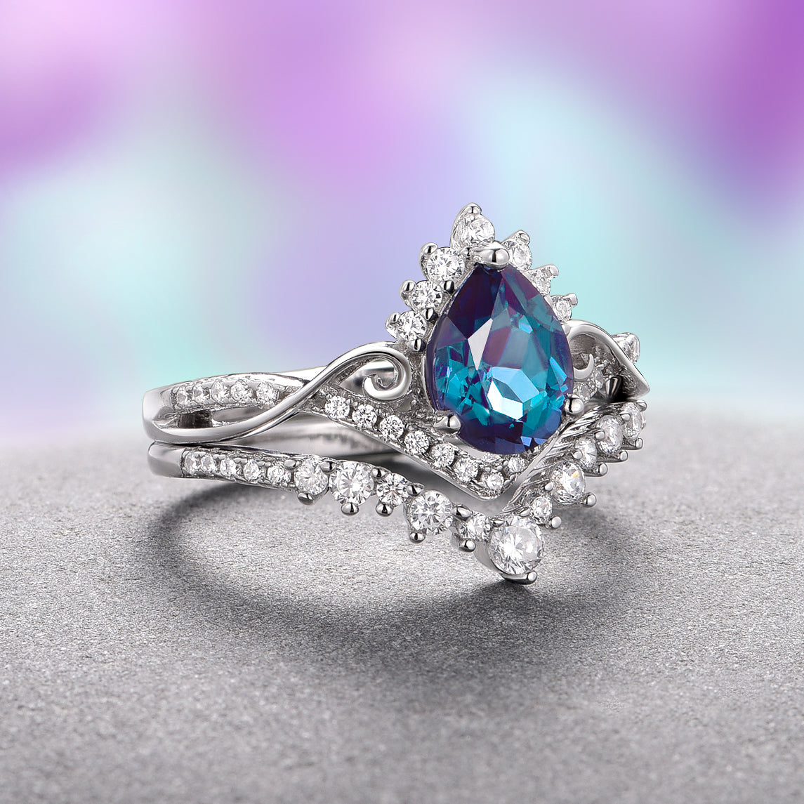 Enchant your love story with the Faye Alexandrite Engagement Ring Set, a mesmerizing 2-piece fairy-inspired ring set crafted in 925 sterling silver. Designed for those who adore magical, nature-inspired jewelry, this teardrop-shaped alexandrite ring shimmers with color-changing brilliance, symbolizing transformation and everlasting love.