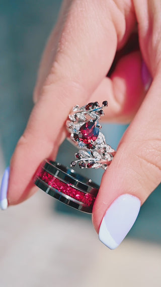 Celebrate your love with this Natural Red Garnet Wisteria Leaf Couples Ring Set, a unique and elegant his-and-hers wedding band set designed for couples who appreciate nature-inspired beauty and timeless craftsmanship. Crafted from sterling silver and tungsten, these matching rings symbolize passion, strength, and commitment in a stunning two-tone design.