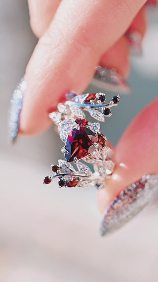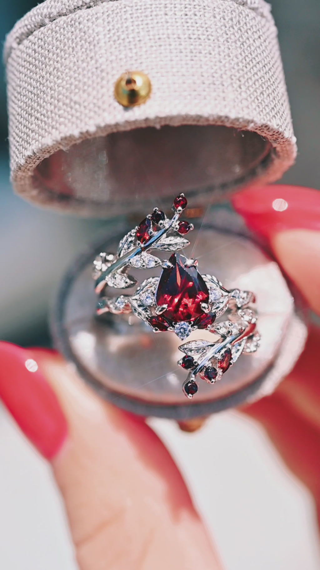 ►The women’s ring features a breathtaking natural pear-cut red garnet, elegantly set in a 925-sterling silver band with a delicate wisteria leaf design. This handcrafted piece is perfect for those who love minimalist, nature-inspired jewelry.