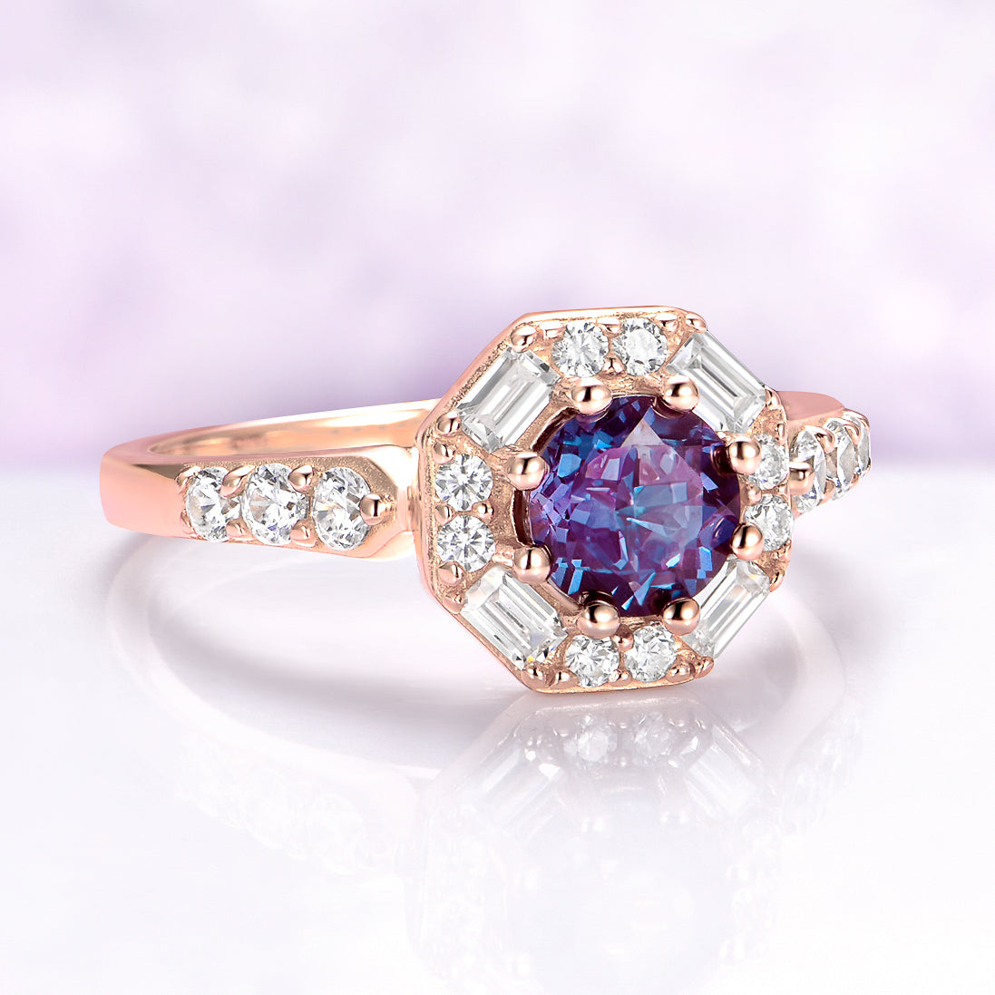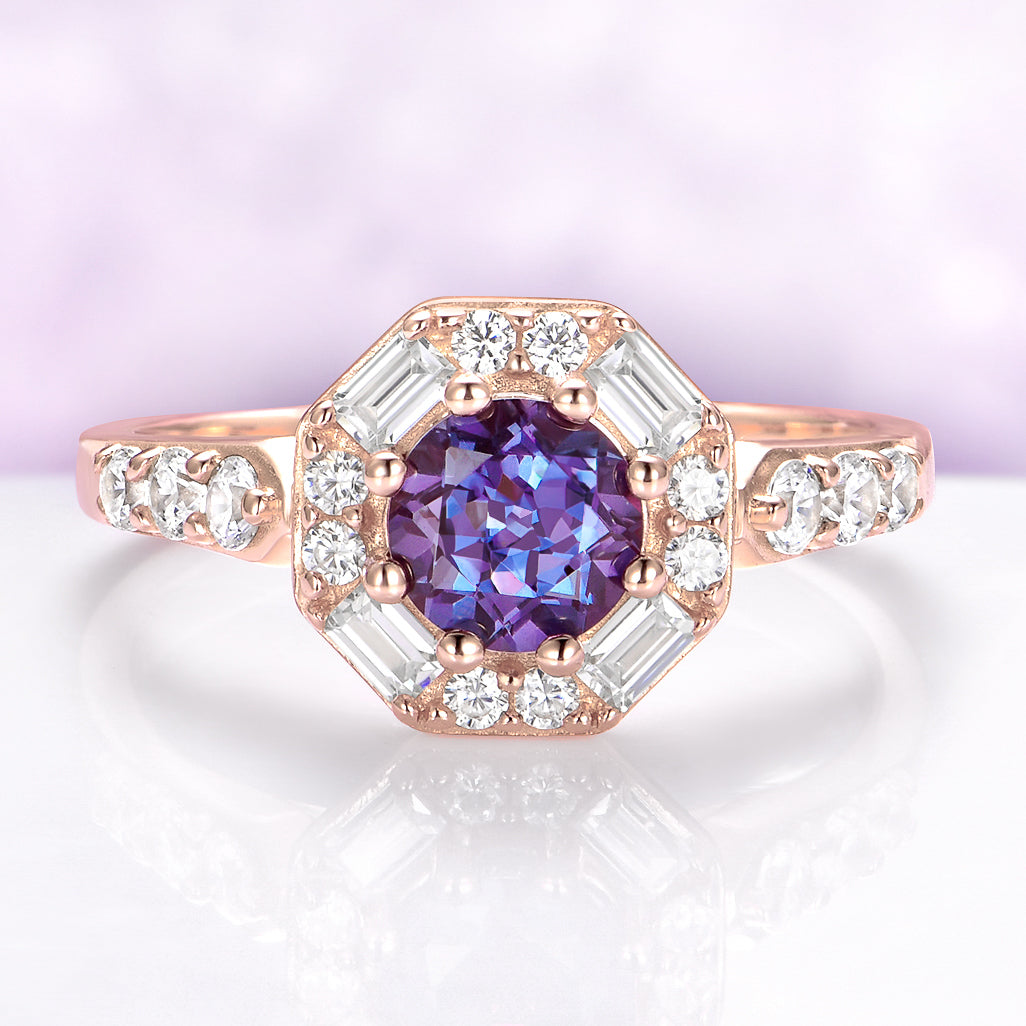 Hexagon Alexandrite Halo Ring in 14K Rose Gold Vermeil