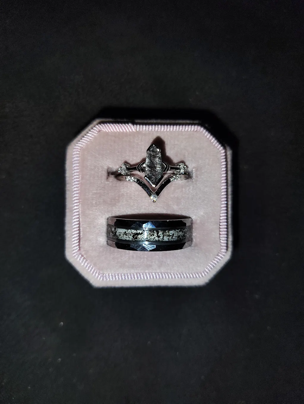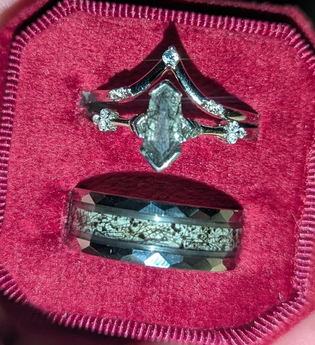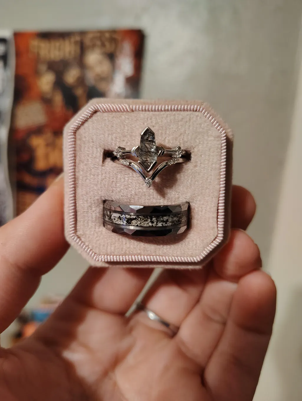 Beautiful rings. I received them in the expected timeframe, even with a custom size. These included the wedding band for the groom and the 2 stacked rings for the bride. The stones are gorgeous and although my phone isn't focusing on them, I can see the sharp rutile inclusions in the stone. Prettier than I ever imagined.