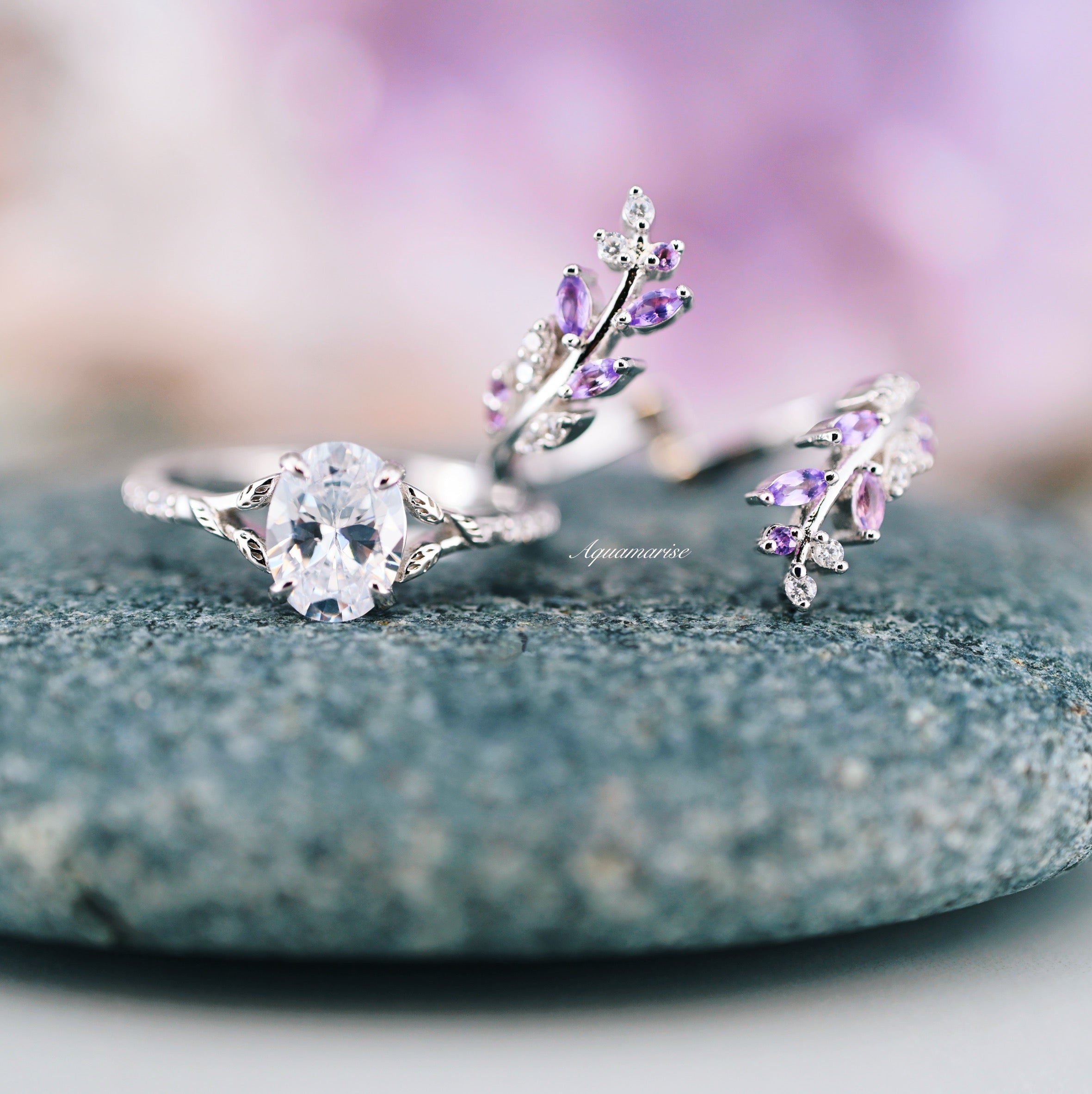 Simulated Diamond & Amethyst Leaf Couples Ring Set