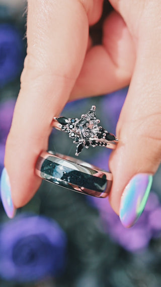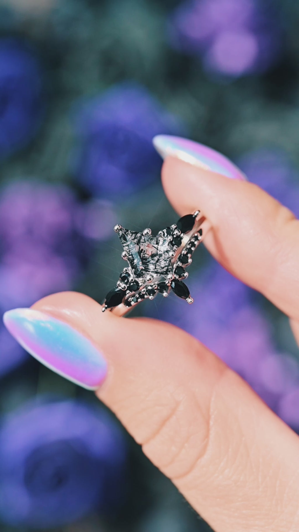Skye Kite Cut Natural Rutilated Quartz & Black Onyx Couples Ring Set, a stunning embodiment of timeless elegance and shared love. Crafted with meticulous attention to detail, this enchanting ring set is a symbol of connection, harmony, and the unique bond between two individuals.