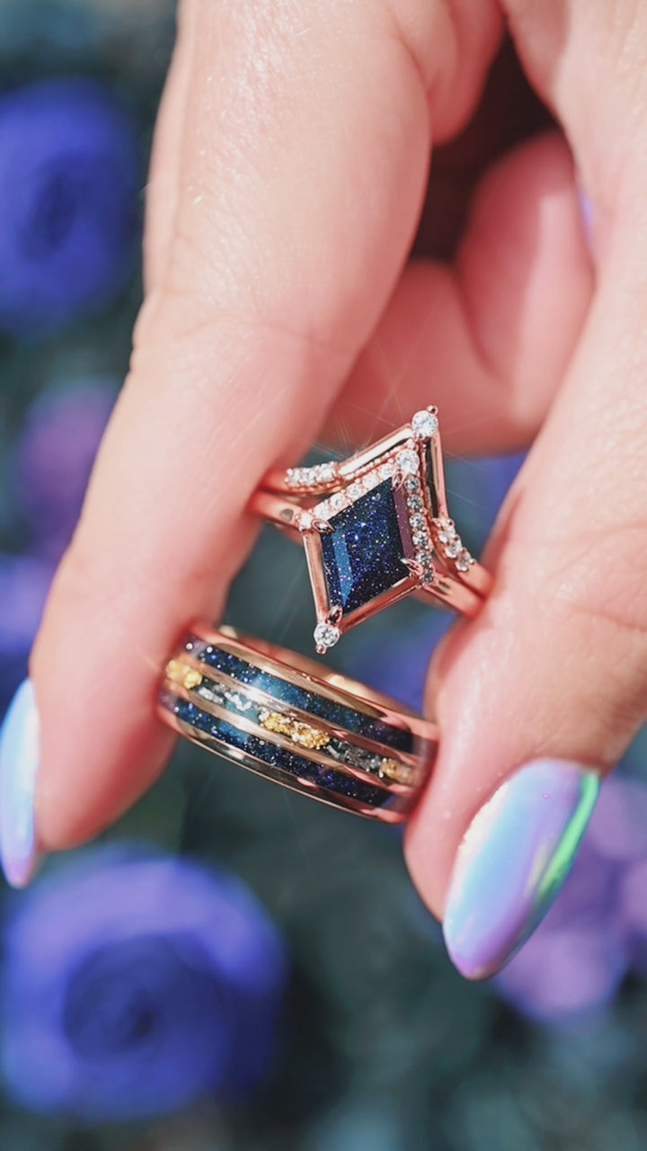 ►His ring is polished and dome rose gold Tungsten Carbide with Crushed Galaxy Sandstone, Meteorite, and Gold Leaf Foil.