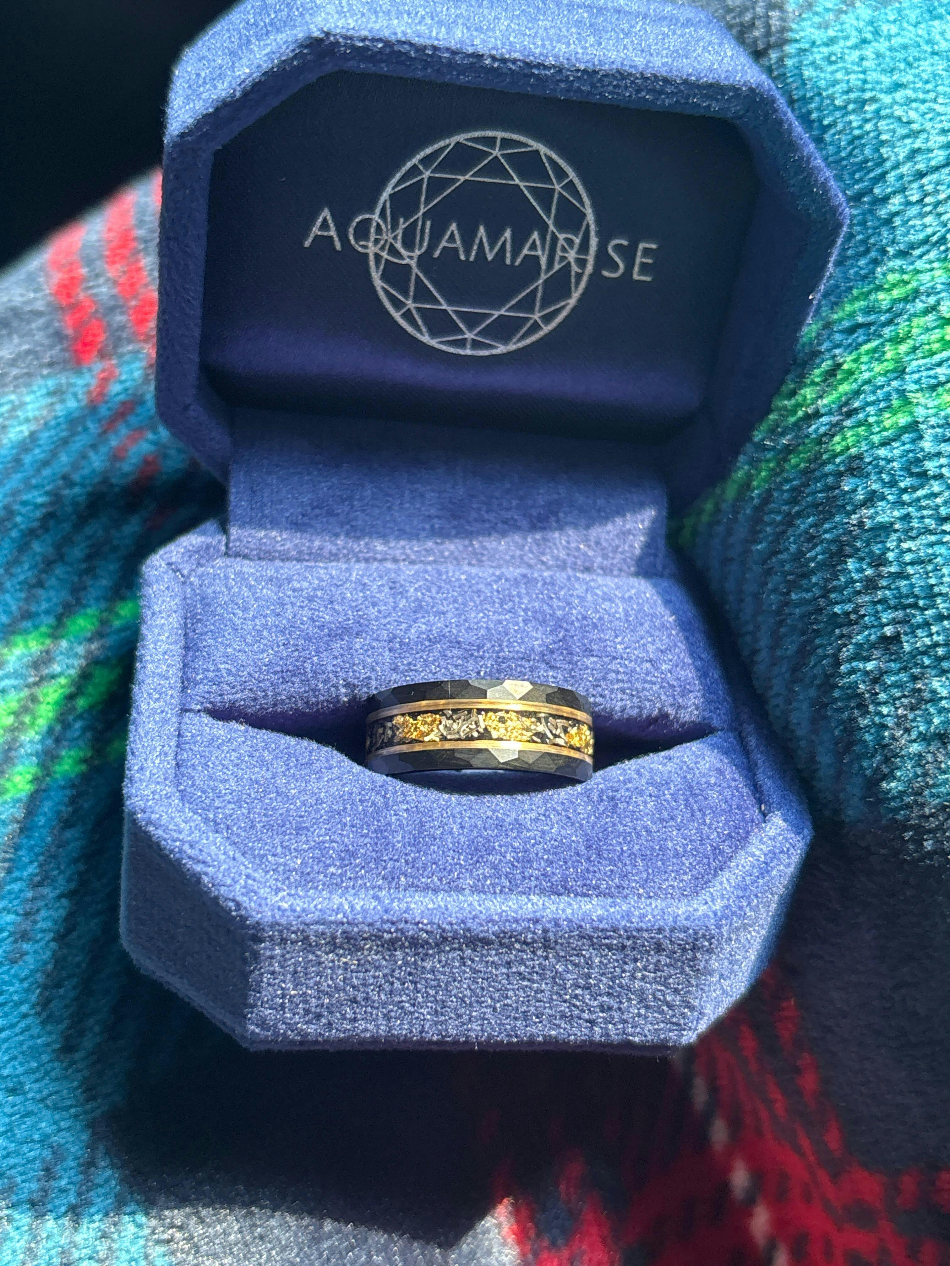 ► His Ring: Crafted in durable tungsten carbide, this 8mm band showcases a rugged brushed black hammered finish, accented with a sleek brushed yellow gold strip. The inlay features genuine meteorite fragments mixed with yellow gold leaf, symbolizing a love as timeless and infinite as the stars. Designed with a comfort-fit interior, it is both bold and enduring for everyday wear.