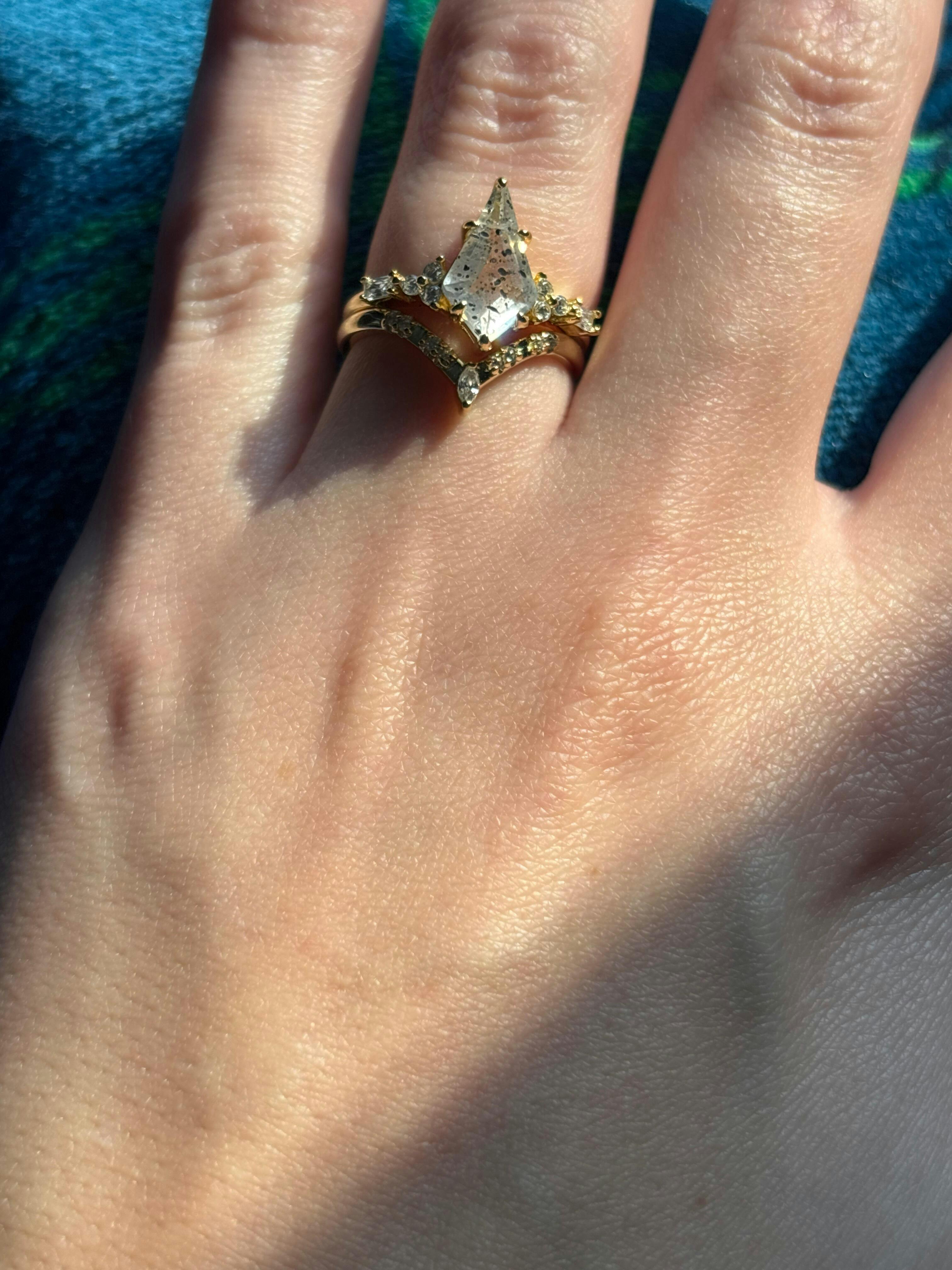 ► Her Ring: From our signature Skye Kite® collection, her engagement ring is crafted in luminous 14k yellow gold vermeil over 925 sterling silver and features a striking 6x12mm (approx. 1.7 ct) natural Herkimer diamond in a distinctive kite cut. Accented with shimmering CZ stones, this unique design celebrates individuality, cosmic beauty, and everlasting devotion.