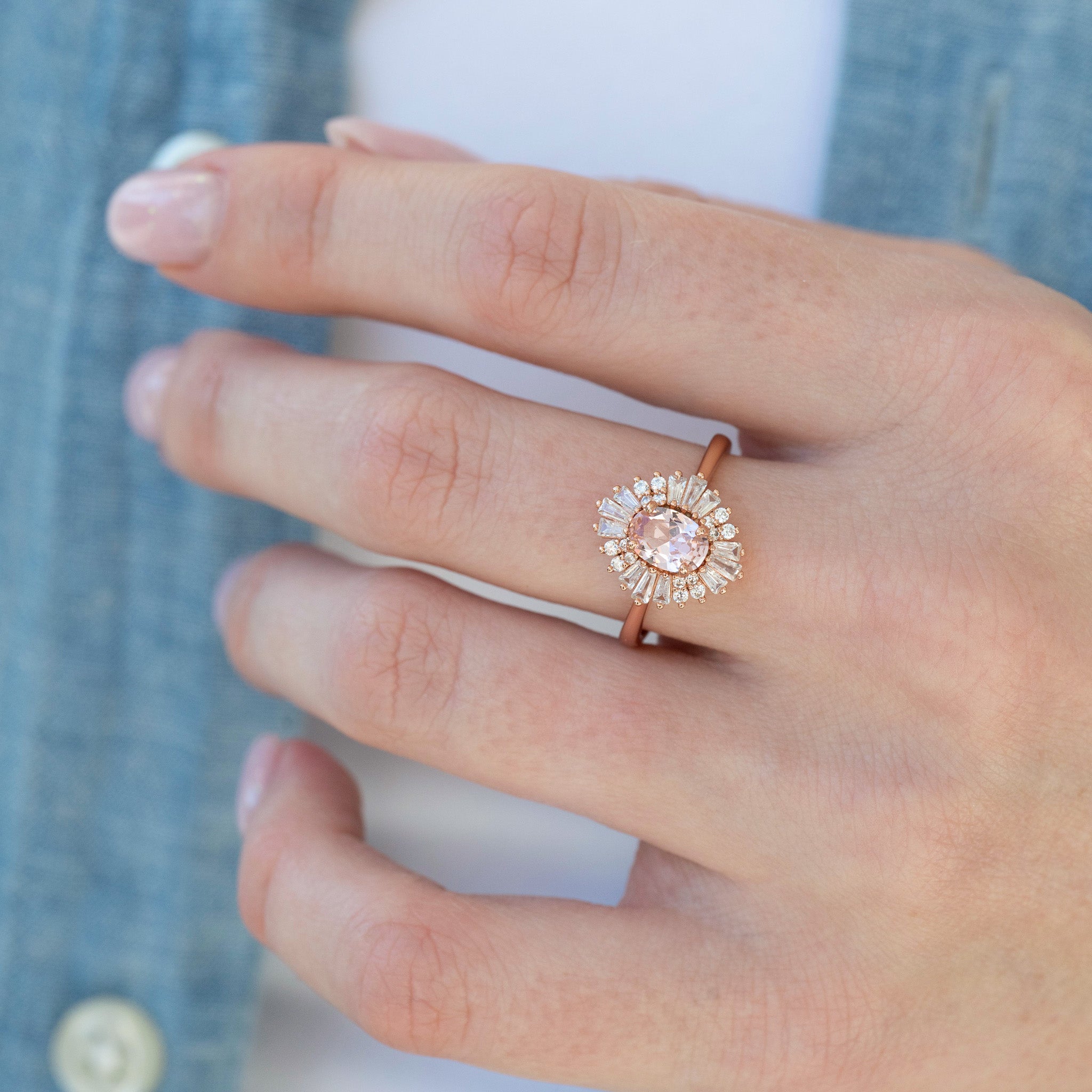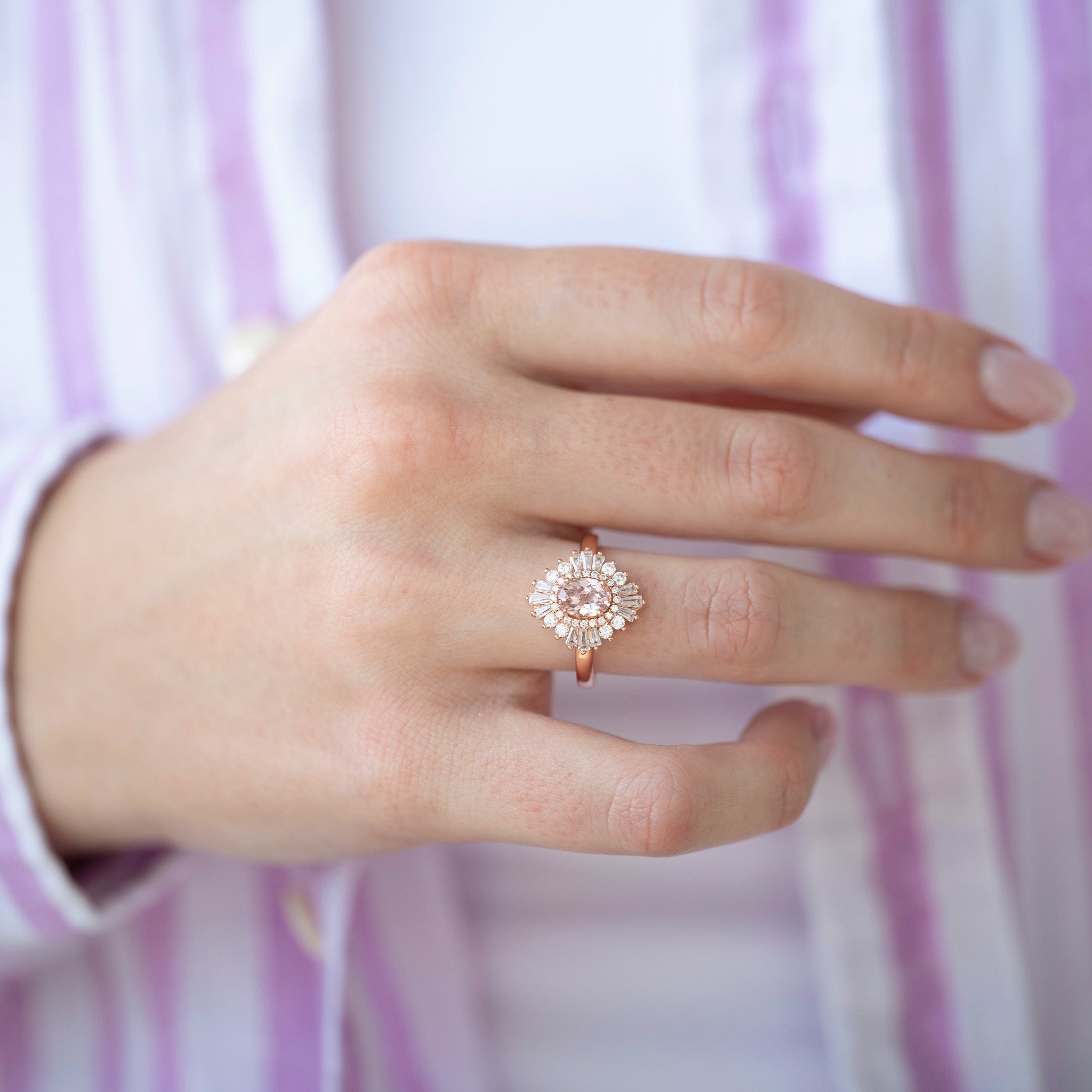 The Victoria Morganite Ring in 14K solid rose gold is a stunning vintage-inspired piece, featuring a captivating oval-cut natural morganite as its centerpiece. Encircled by brilliant moissanite accents, this ring exudes timeless elegance and romantic sophistication. The soft blush hue of the morganite symbolizes compassion, love, and emotional healing, while the warm rose gold band adds a graceful and feminine touch. With its radiant sparkle and vintage charm, this ring is perfect for an engagement, anniversary gift, or heirloom piece, ideal for those who appreciate elegant and non-traditional fine jewelry.
