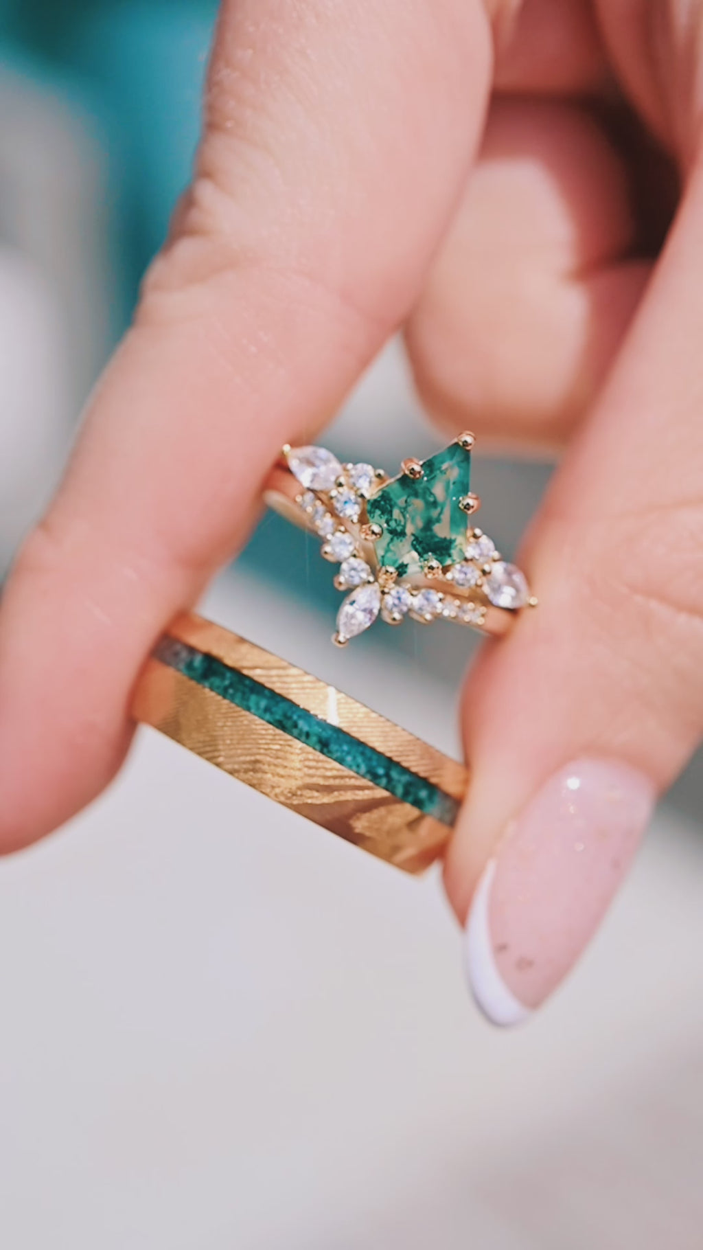 This luxury Damascus steel wedding band features a striking yellow gold finish and a crushed green moss agate inlay that captures the essence of nature’s tranquility. Designed for comfort and durability, this unique ring is perfect as a wedding band, promise ring, or anniversary gift for him. Each piece combines artistry with craftsmanship, offering a timeless symbol of love and individuality.