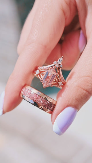 ►For Her: Envisioned as a tribute to femininity and grace, the Hers Wedding Band features a delicate Celtic knot pattern, symbolizing the unbreakable strength of love and unity. Adorned with a brilliant hexagon-cut morganite gemstone at its center, this ring radiates a subtle blush hue, accentuating the wearer's natural beauty and sophistication.