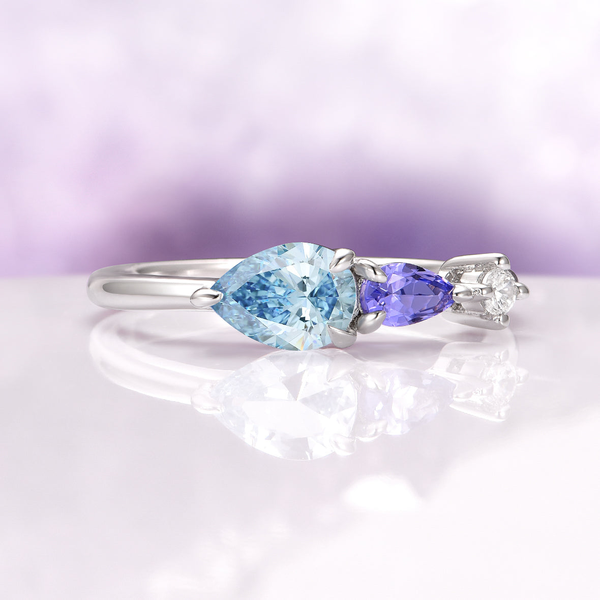 ►Tanzanite is prized for its captivating blue-violet tones, adding a vibrant contrast to the aquamarine’s serene color. Together with the brilliance of moissanite, the accents create a perfect balance of color and sparkle.