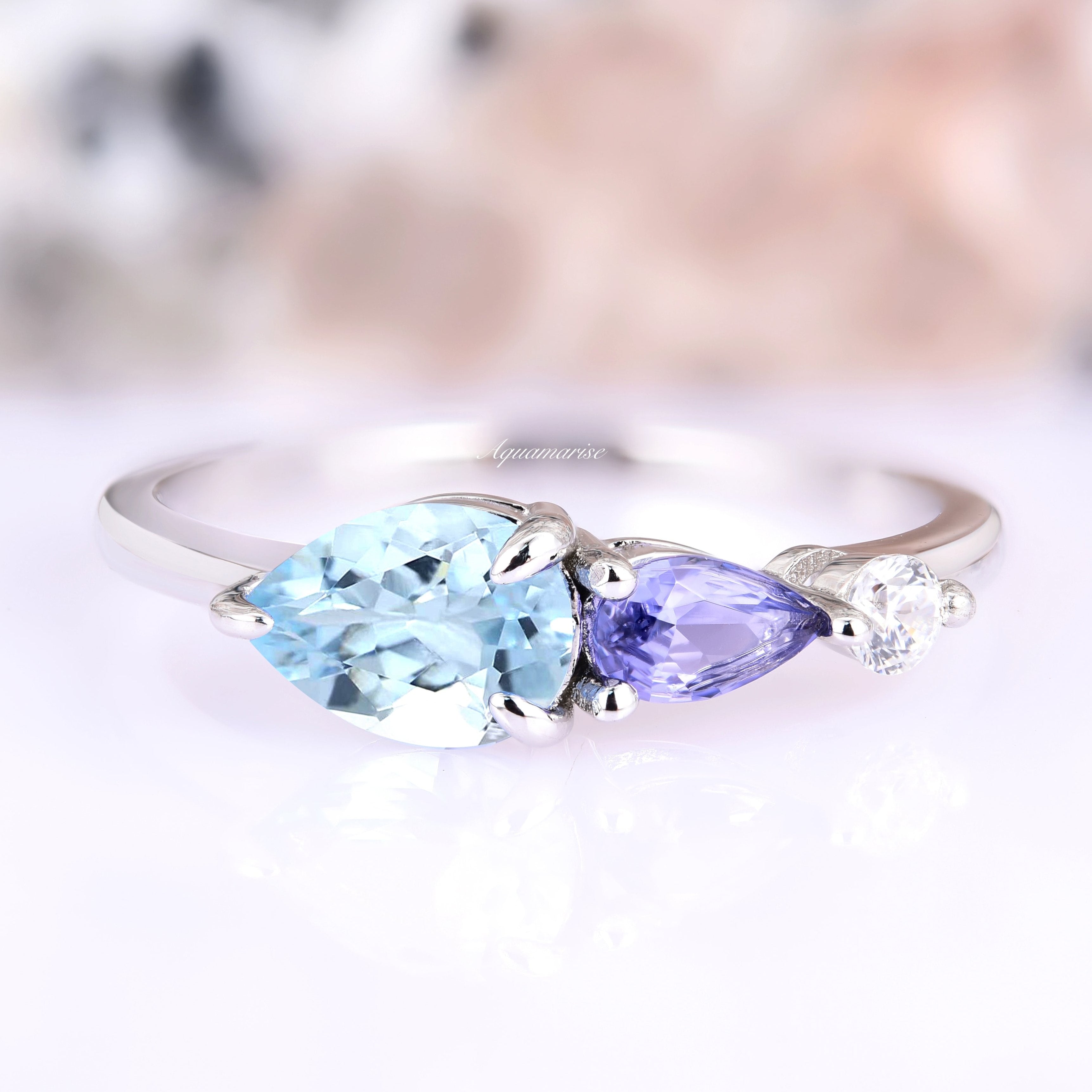 This Pear Cut Aquamarine & Tanzanite Ring in 14k solid white gold blends the serene beauty of aquamarine with the rich hues of tanzanite and the brilliance of moissanite. Perfect for women who appreciate timeless elegance, meaningful details, and distinctive designs, this ring makes a truly unique and sophisticated statement.