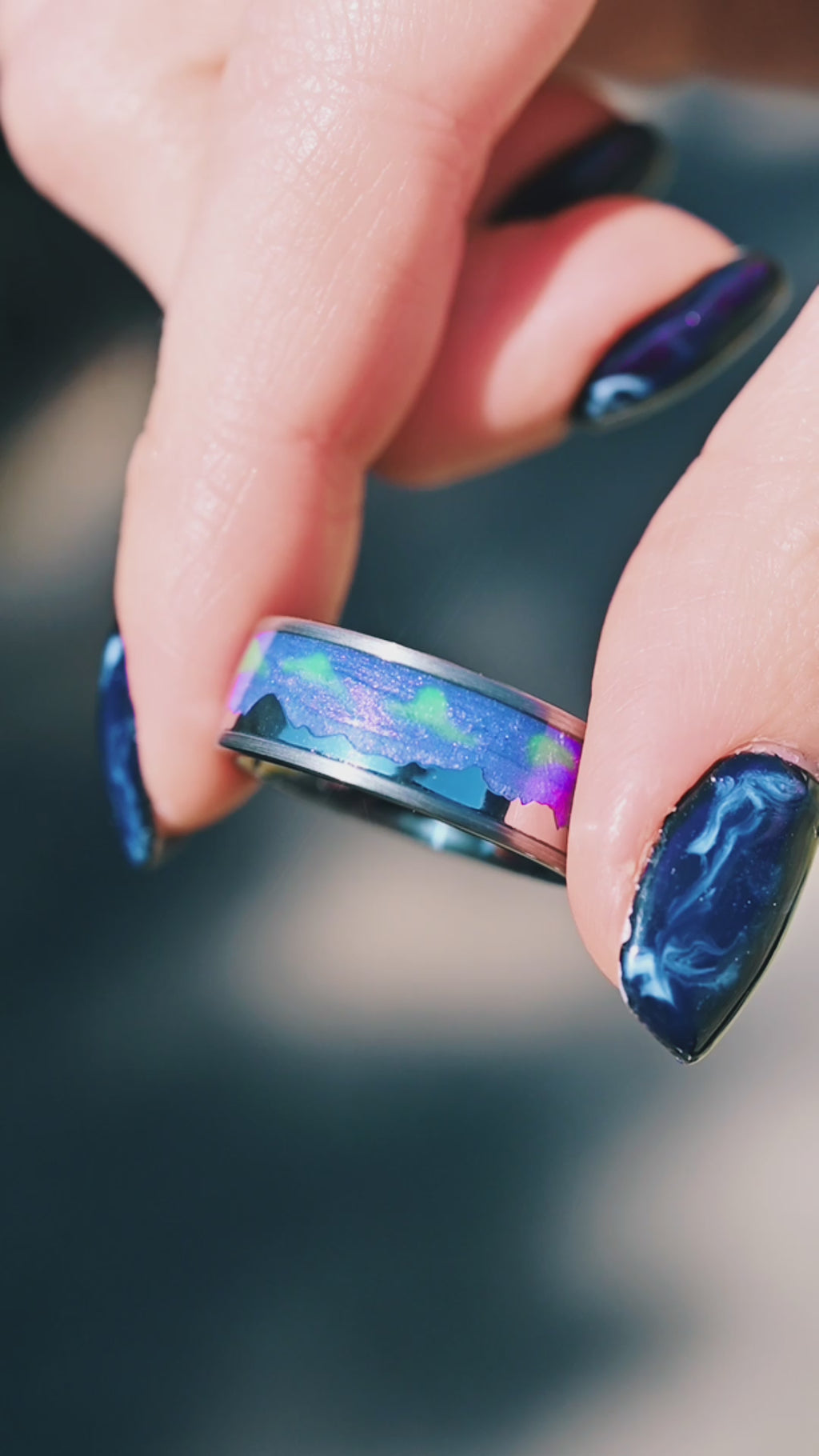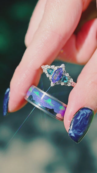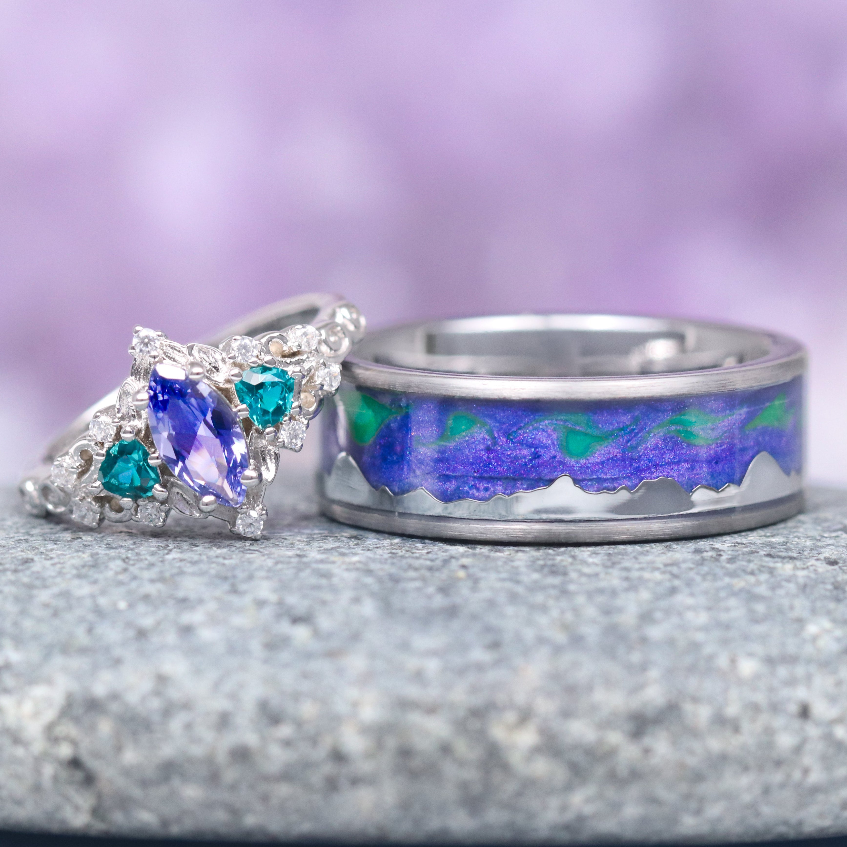 Celebrate your love with this Borealis Tanzanite & Teal Sapphire Couples Ring Set, a stunning matching wedding band set inspired by the Northern Lights, celestial beauty, and the majesty of mountain landscapes. Designed for couples who share a love for adventure, the cosmos, and nature, these rings blend elegance, durability, and unique artistry into a perfect symbol of your everlasting bond.