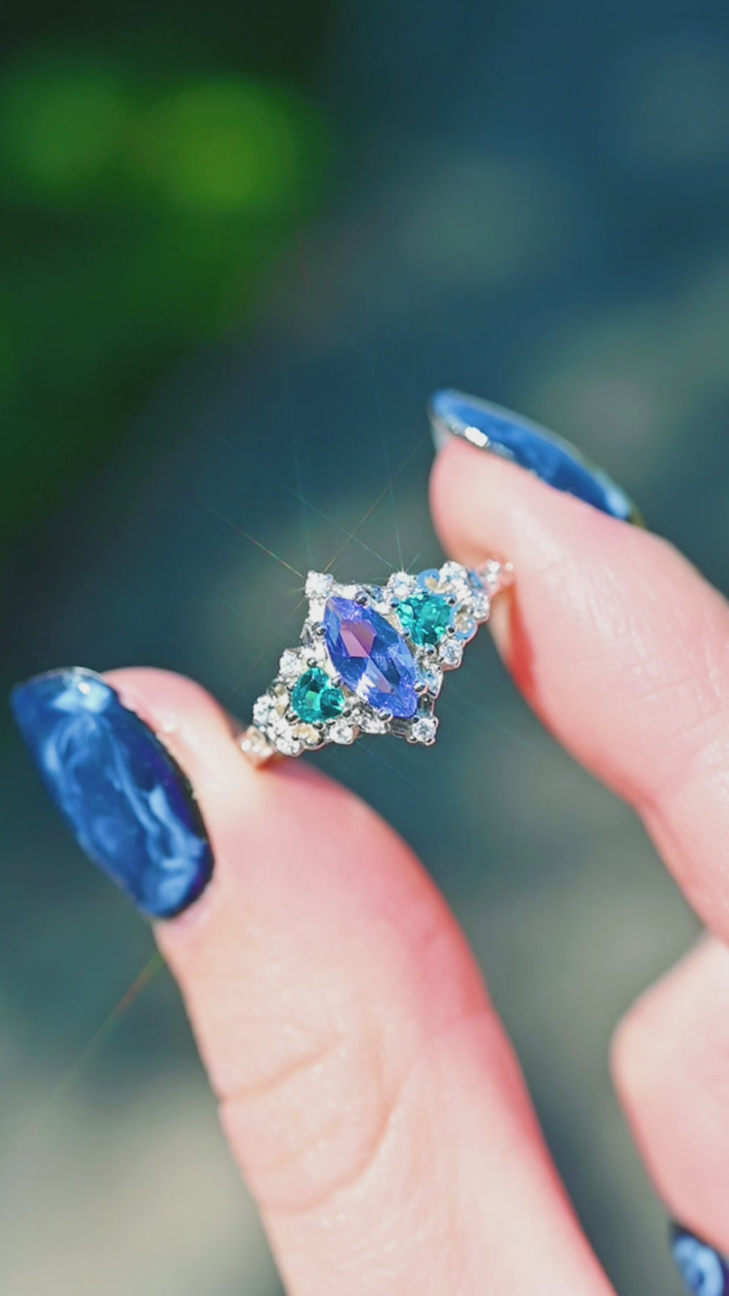 ►The women’s ring features a breathtaking marquise-cut simulated tanzanite, glowing with deep violet-blue hues, symbolizing intuition, wisdom, and everlasting love. Sparkling simulated teal sapphires and cubic zirconia diamonds accent the setting, enhancing its ethereal charm.