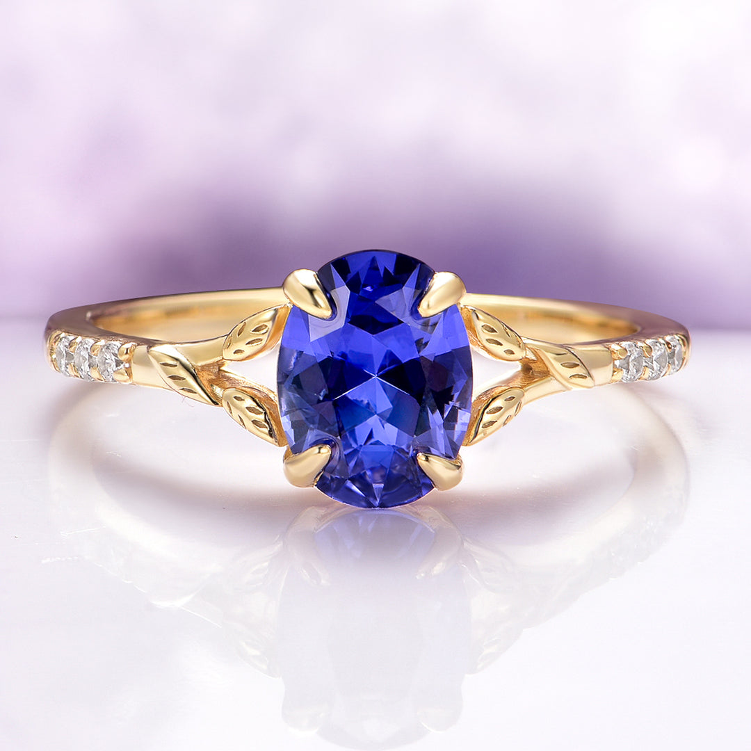 An oval-cut purple sapphire ring with a fairy leaf design, crafted in 14K white gold, displayed against a textured background.