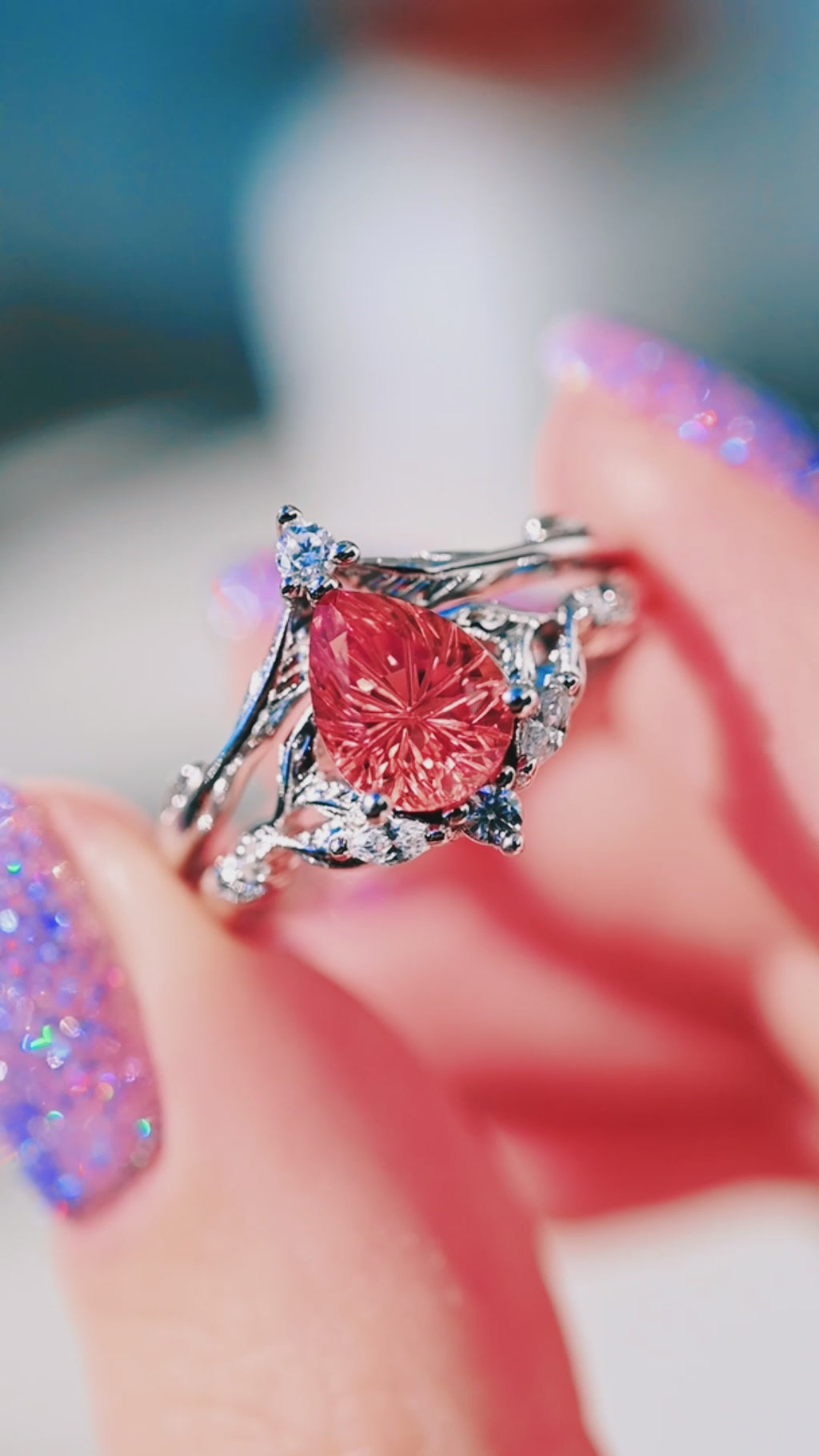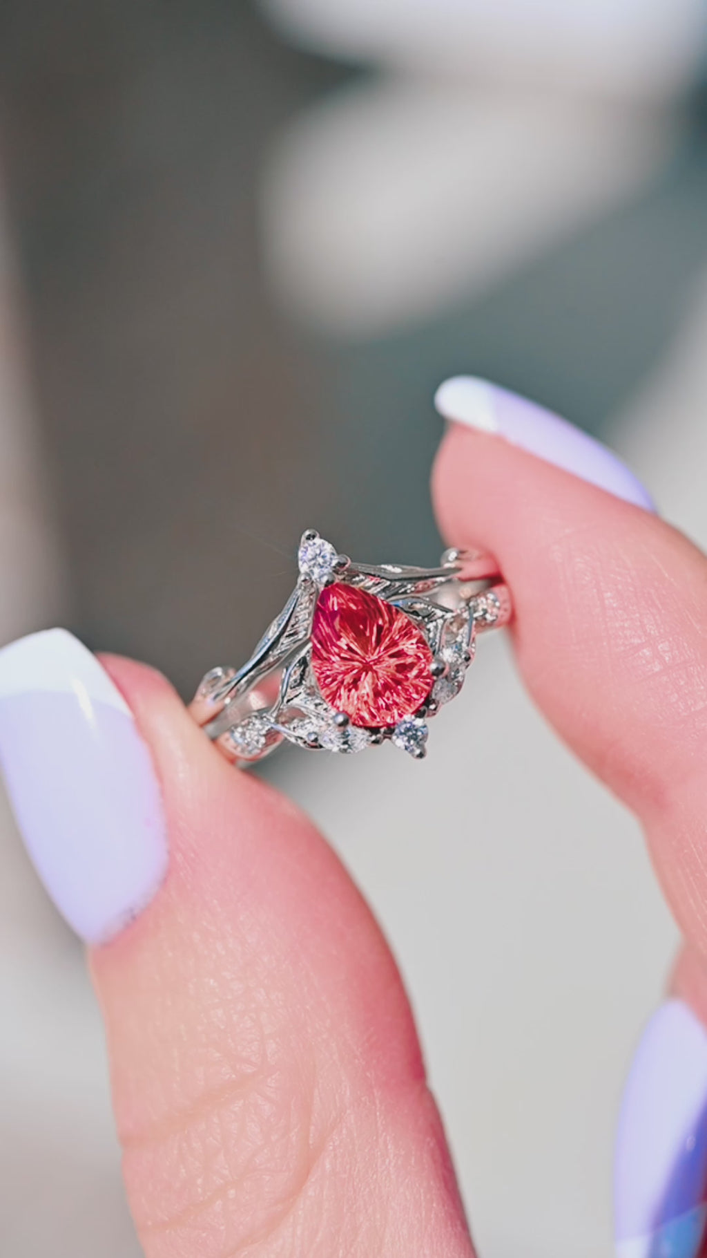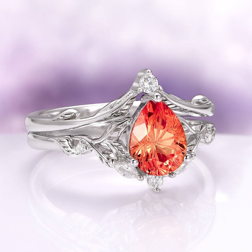 Celebrate your love with the Fireworks-Cut Padparadscha Sapphire Ring Set, a one-of-a-kind design that blends timeless elegance with magical, fantasy-inspired artistry.