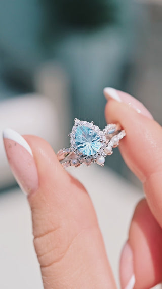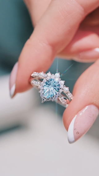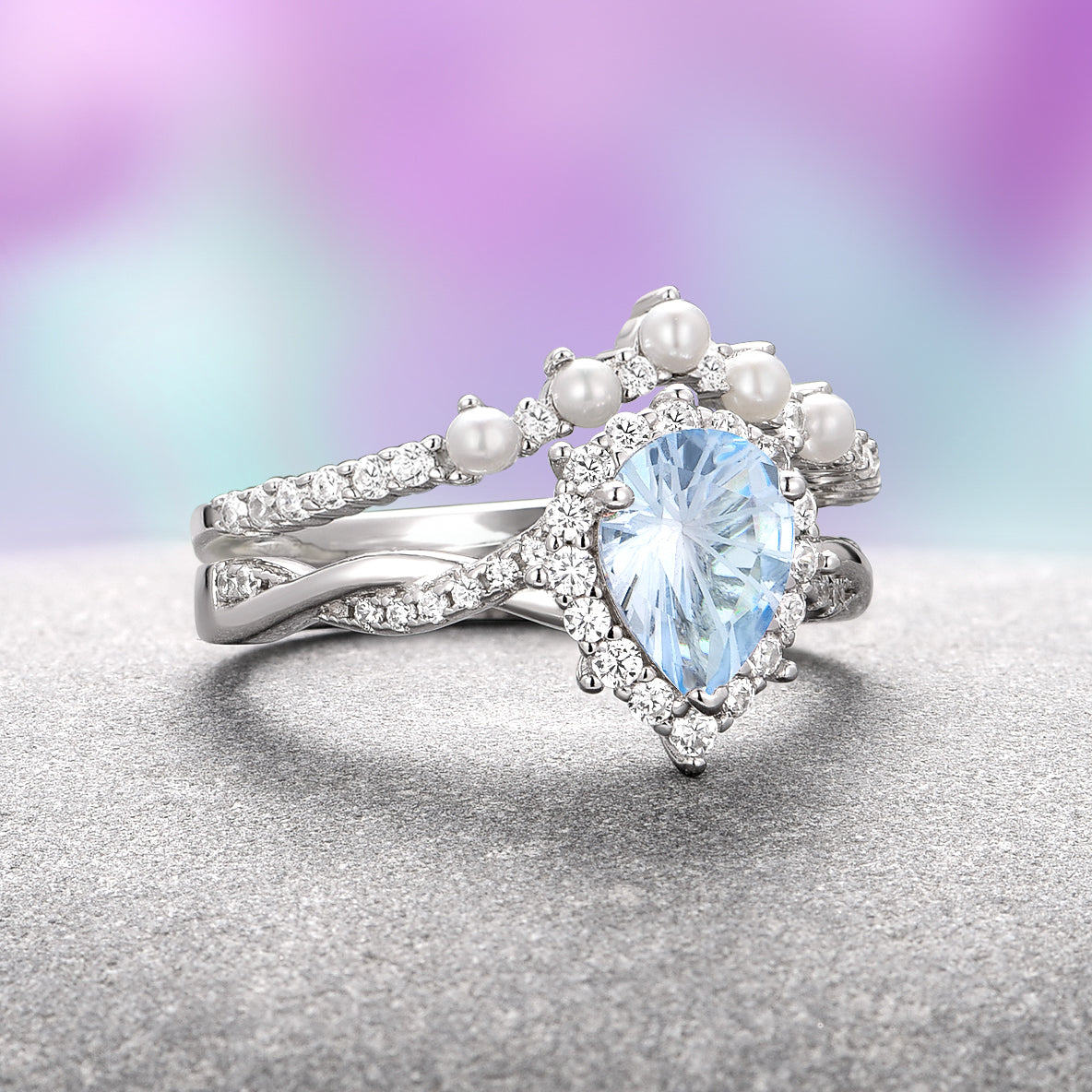 Introducing our enchanting Briar Aquamarine & Pearl Engagement Ring Set, a non-traditional engagement ring set inspired by fairytales and fantasy. Crafted with love and precision, this magical piece features a shimmering pear-shaped simulated aquamarine, nestled within a beautifully sculpted 925 sterling silver setting.