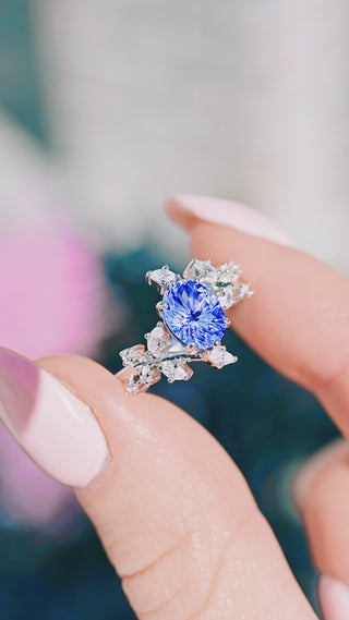 Elevate your style with the magical charm of the Fantasy Fireworks Oval Cut Purple Sapphire Fairy Leaf Ring. Expertly crafted in 14K white gold, this enchanting piece features a mesmerizing oval-cut purple sapphire as its centerpiece, radiating elegance and whimsy. The intricate fairy leaf design adds a touch of nature-inspired fantasy, making this ring truly one-of-a-kind.