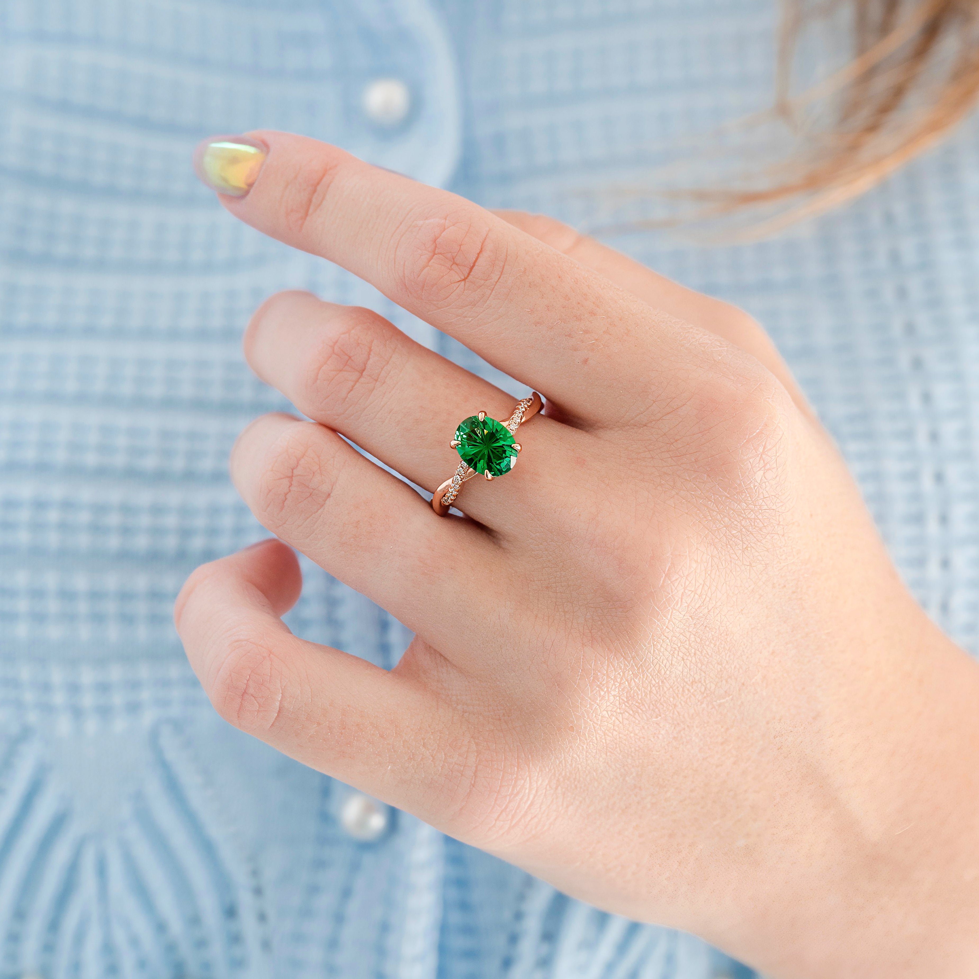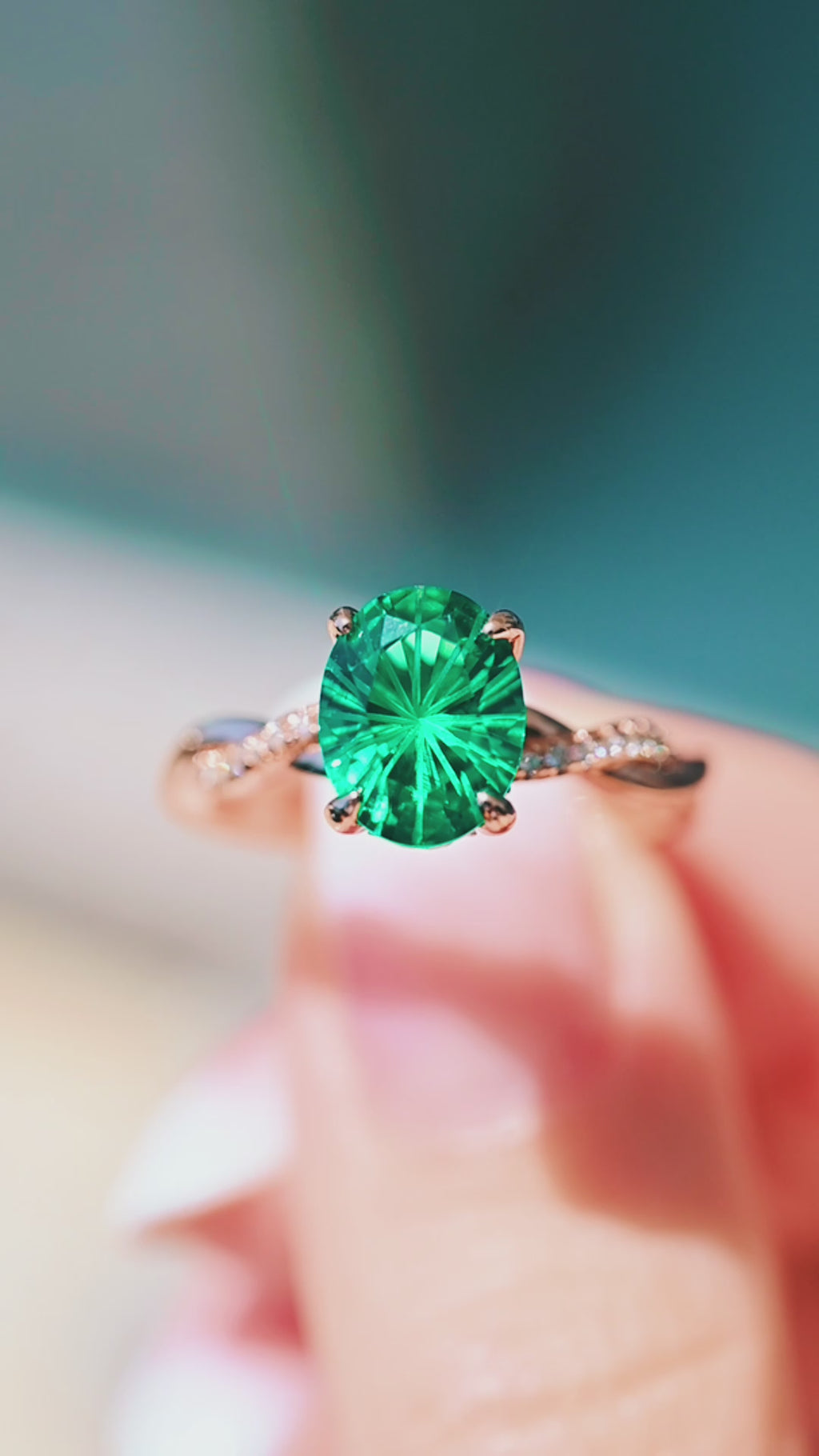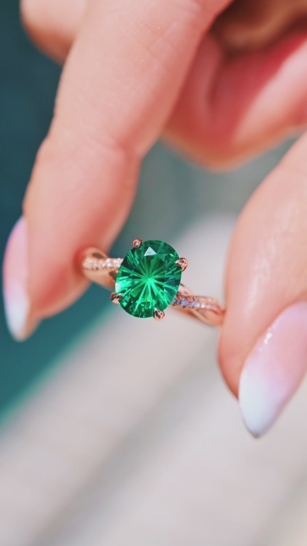 Celebrate love with a ring as unique as she is. This stunning Fireworks Cut Emerald Ring features a bold and brilliant center stone in a rare 7x9 mm fireworks oval cut, radiating light with every movement. Set in a romantic twisted vine band and finished in luxurious 14K rose gold vermeil, this piece is the perfect engagement ring, promise ring, or anniversary gift for someone born in May—or anyone who loves a touch of green magic.