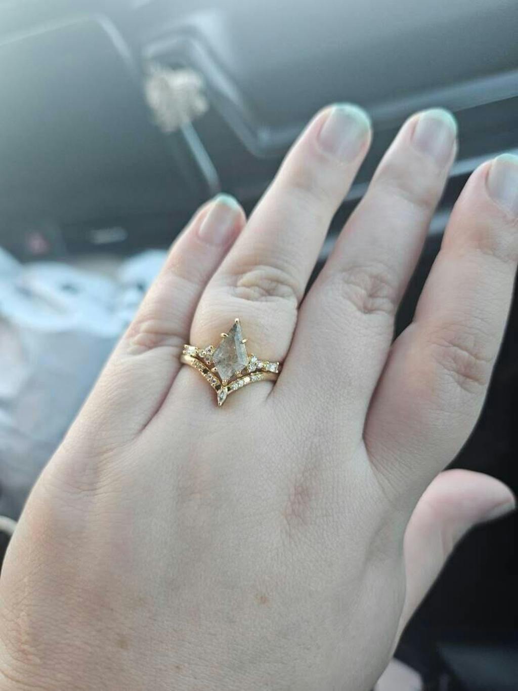 Elevate your style with this gorgeous kite cut salt & pepper Herkimer diamond ring set, crafted from 925 solid sterling silver with a protective rhodium finish. Designed as a versatile statement piece, this ring can be worn as an engagement ring, promise ring, birthstone ring, or everyday statement piece.