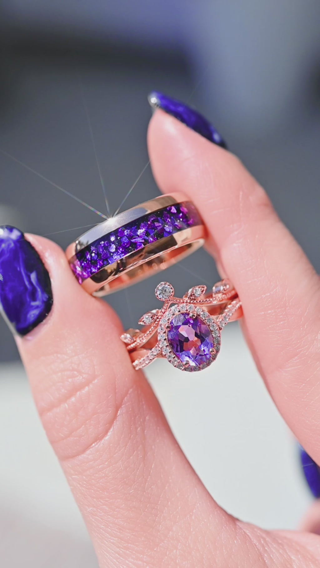 Together, these rings create a harmonious and cosmic union. The amethyst and galaxy sandstone in both rings signify your shared journey through the vastness of life, while the rose gold represents the warmth and love that fuels your partnership.