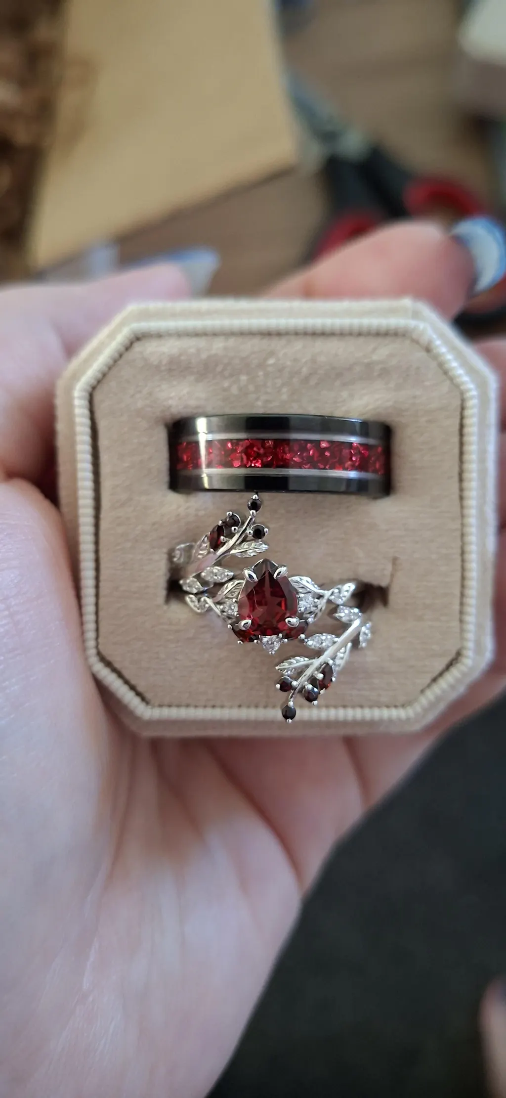 Wisteria Natural Red Garnet Leaf Couples Ring Set