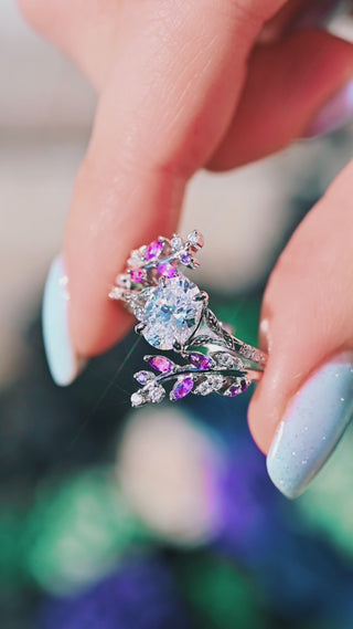 Fairy Amethyst & Simulated Diamond Engagement Leaf Ring Set in Sterling Silver