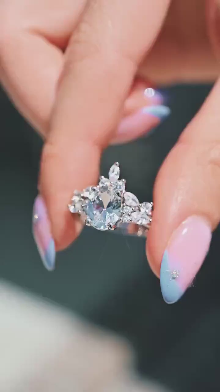 This elegant white sapphire bridal ring set blends timeless beauty with modern sophistication. Featuring a sparkling oval-cut lab-grown white sapphire as the centerpiece, this design is a stunning diamond alternative for engagements, anniversaries, or September birthstone gifts. Handcrafted in solid 925 sterling silver with a rhodium finish, it offers lasting brilliance and durability while maintaining an effortlessly refined look.