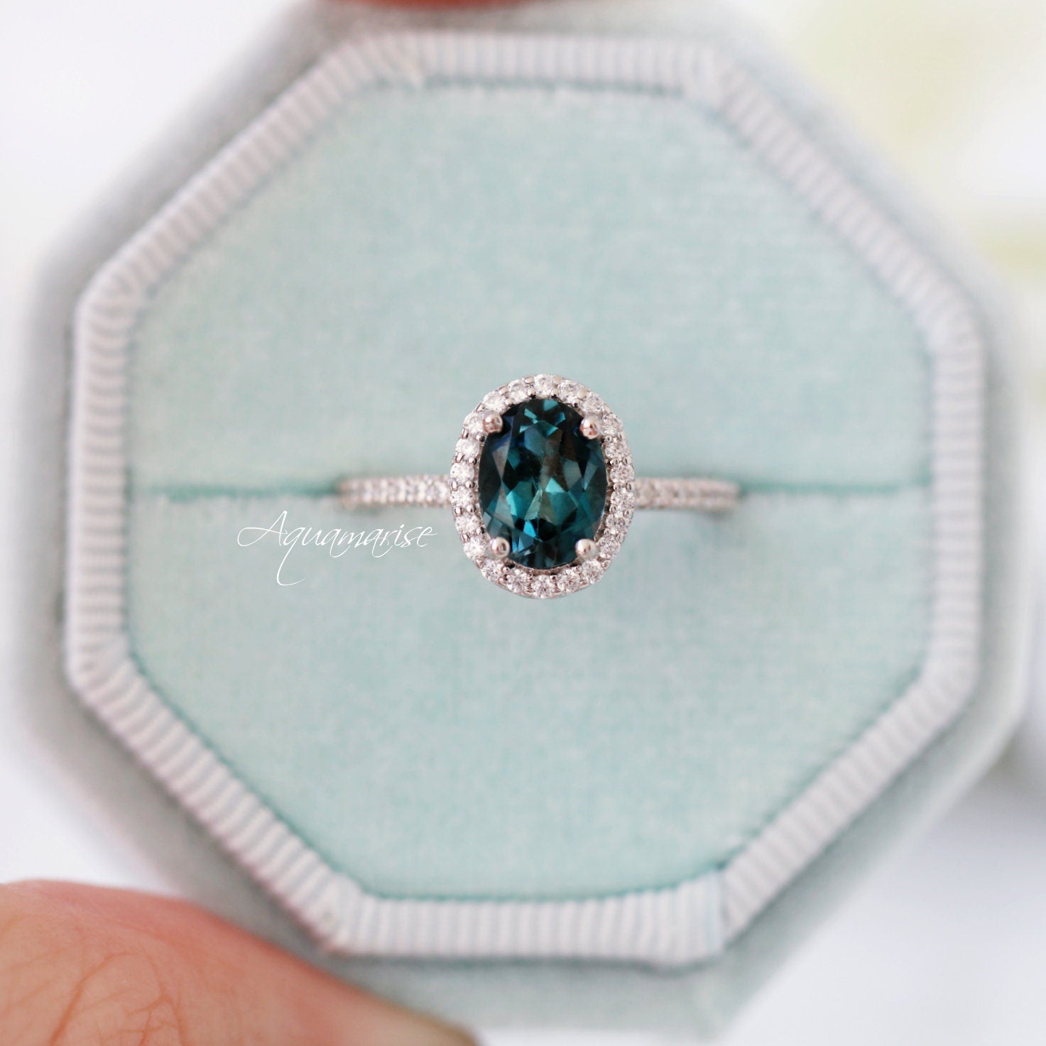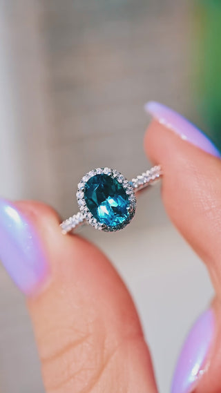 Delicate and radiant, the Iris Topaz Ring in 14K Solid White Gold features a deep, mesmerizing London blue topaz center stone in a graceful halo setting. Accented by sparkling moissanite or natural diamond stones, this non-traditional engagement ring perfectly balances timeless elegance with a bold, modern twist.
