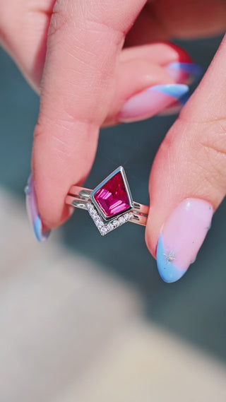 Introducing the Kite Ruby Bezel Engagement Ring Set, a vintage-inspired design that radiates passion, artistry, and timeless devotion. Handcrafted in solid 14K white gold, this heirloom-quality set features a striking kite-cut lab-grown ruby, admired for its vivid crimson hue that symbolizes love, courage, and enduring commitment. The center stone is securely held in a sleek bezel setting for modern refinement and durability. A perfectly matched white gold chevron wedding band, accented with your choice of moissanite or natural diamonds, completes the set to create a harmonious symbol of unity and romance. Distinctive yet enduring, this ring set is a meaningful reflection of a love story built to last for generations.