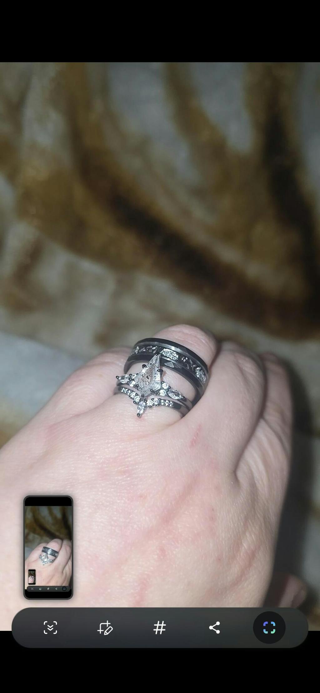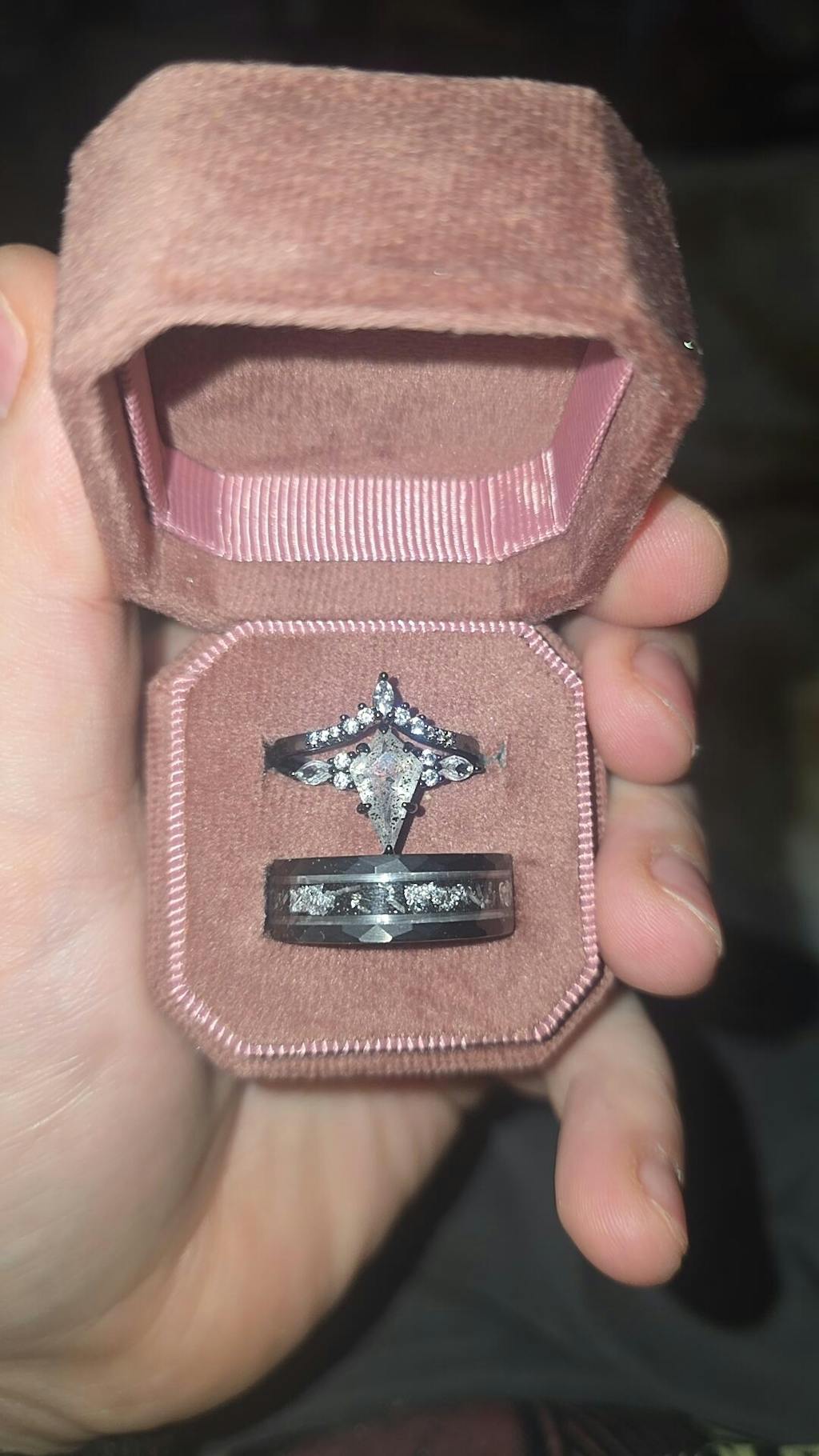 Amazing! Very happy with my rings and the ring for my husband, he absolutely loves it as well! They are so unique to us and fit our personalities. We had traditional rings for our proposal and wedding. And of course I love them.they are gorgeous but I have already had to have them repaired twice and im afraid of ruining them further. I wanted to do something special for our anniversary this year and something for valentine's as well and it just worked out that I was able to give us an early surprise. I've personally went through A LOT of health issues and have been struggling over rhe last few years and as a result my appearance has changed. In going through that I've decided that I no longer want to dress and look in a way that appeases others. I want to simply be myself and express myself through my hair, makeup, clothing, and jewelry. This ring just solidified that for me and for my husband as he's been right beside me through the whole ordeal. It is so special to us just because of our journey.