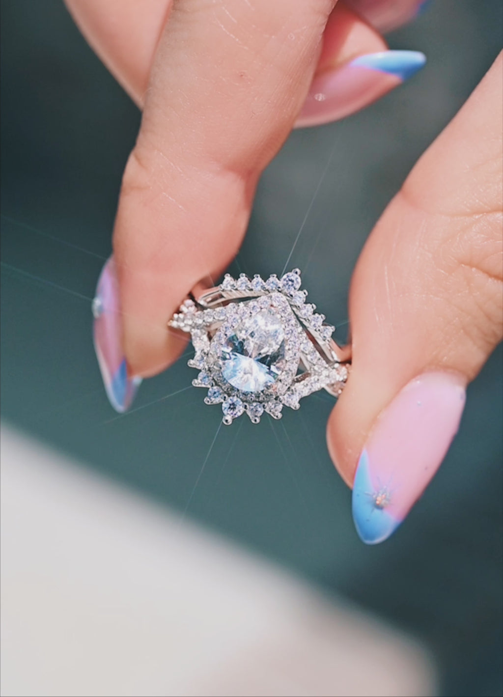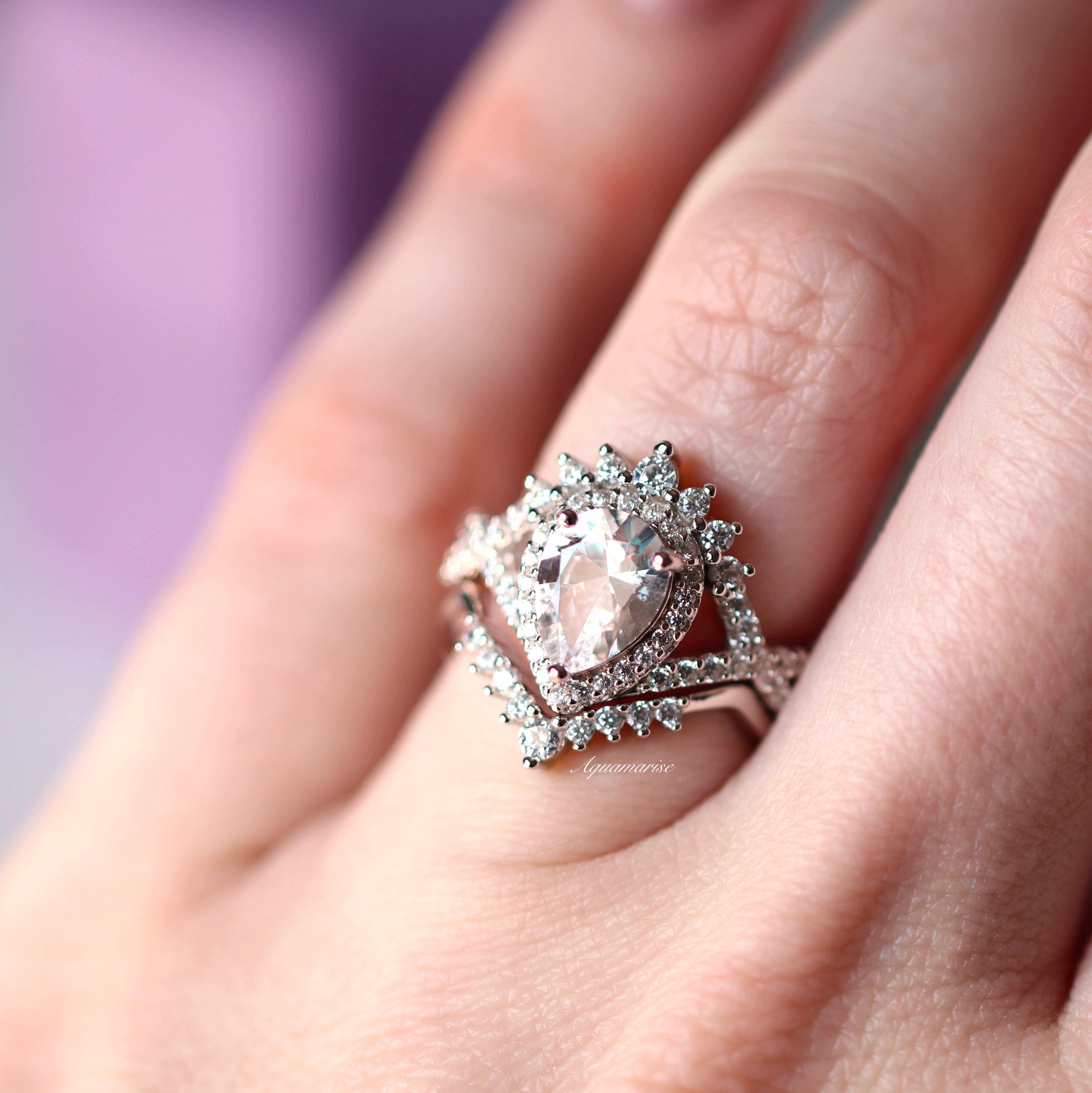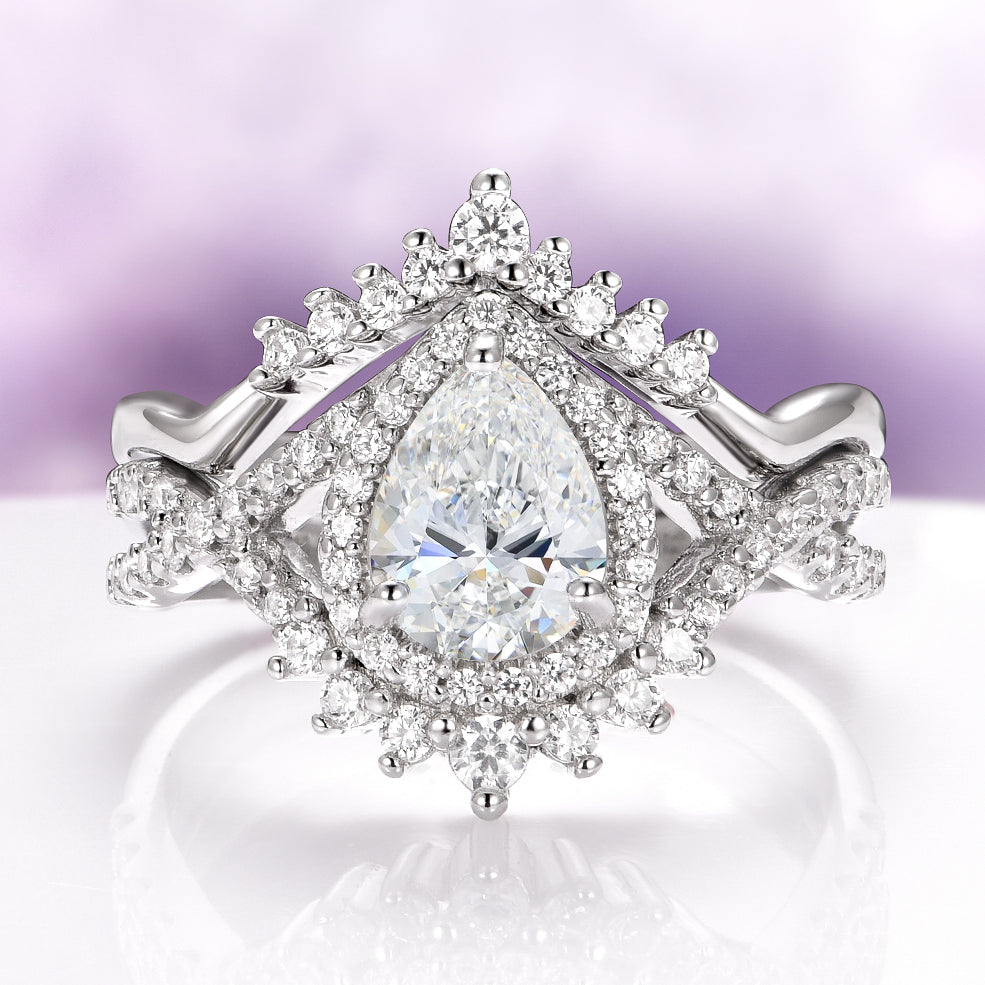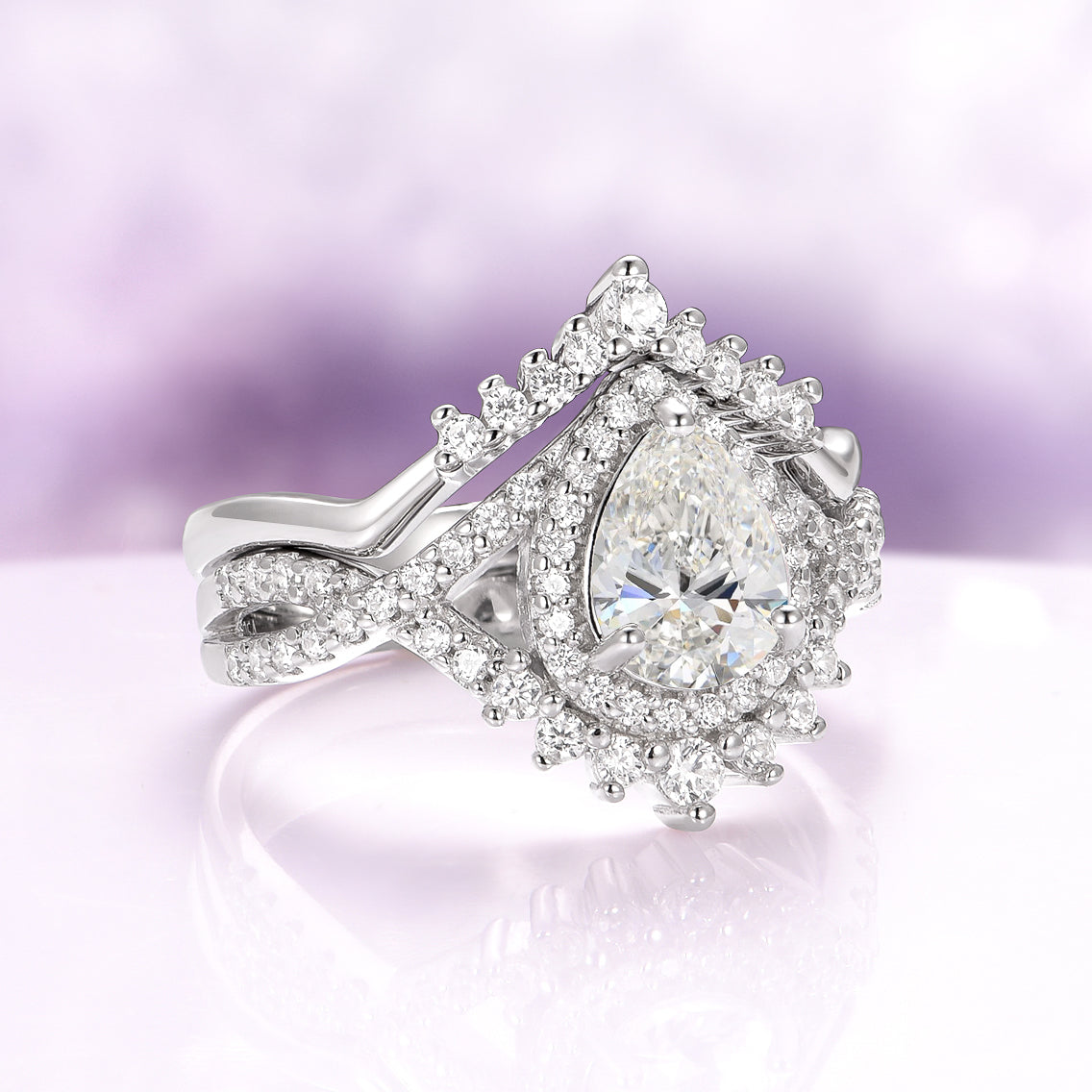 Introducing the Teardrop Moissanite Engagement Ring Set, a modern yet timeless design that radiates brilliance from every angle. Handcrafted in solid 14K white gold, this heirloom-worthy set features a dazzling pear-cut moissanite as the centerpiece, surrounded by a shimmering halo. The twisted band is accented with additional moissanite stones, adding graceful movement and sparkle. A perfectly matched chevron wedding band, also set with moissanites, completes the set with elegance and symmetry. Distinctive yet enduring, this design is the perfect symbol of everlasting love.