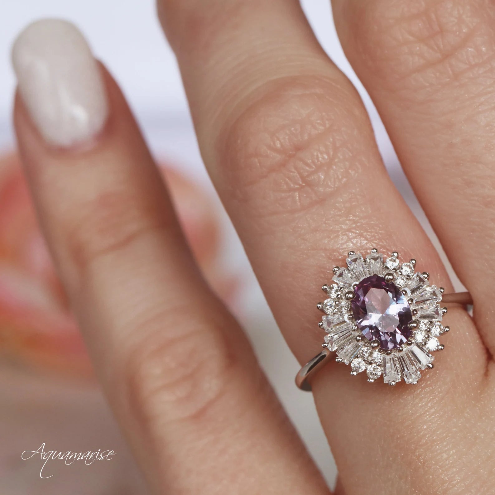 I ordered this lovely ring as a replacement for my original engagement ring which was purchased over 30 years ago (and sadly lost). It had the same "ballerina style" halo baguette setting, but in white gold. And I have to say this ring is even more beautiful, it has more sparkle and the center Alexandrite is so stunning! Also, I prefer the sterling silver setting as it's whiter than white gold. Thank you so very much, I'm a return customer and happy to say I will continue to be! :-)