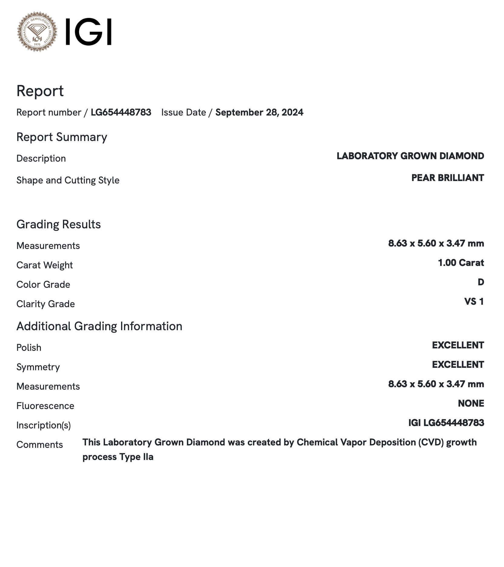 1.0 Carat Pear Lab Grown Diamond (IGI)