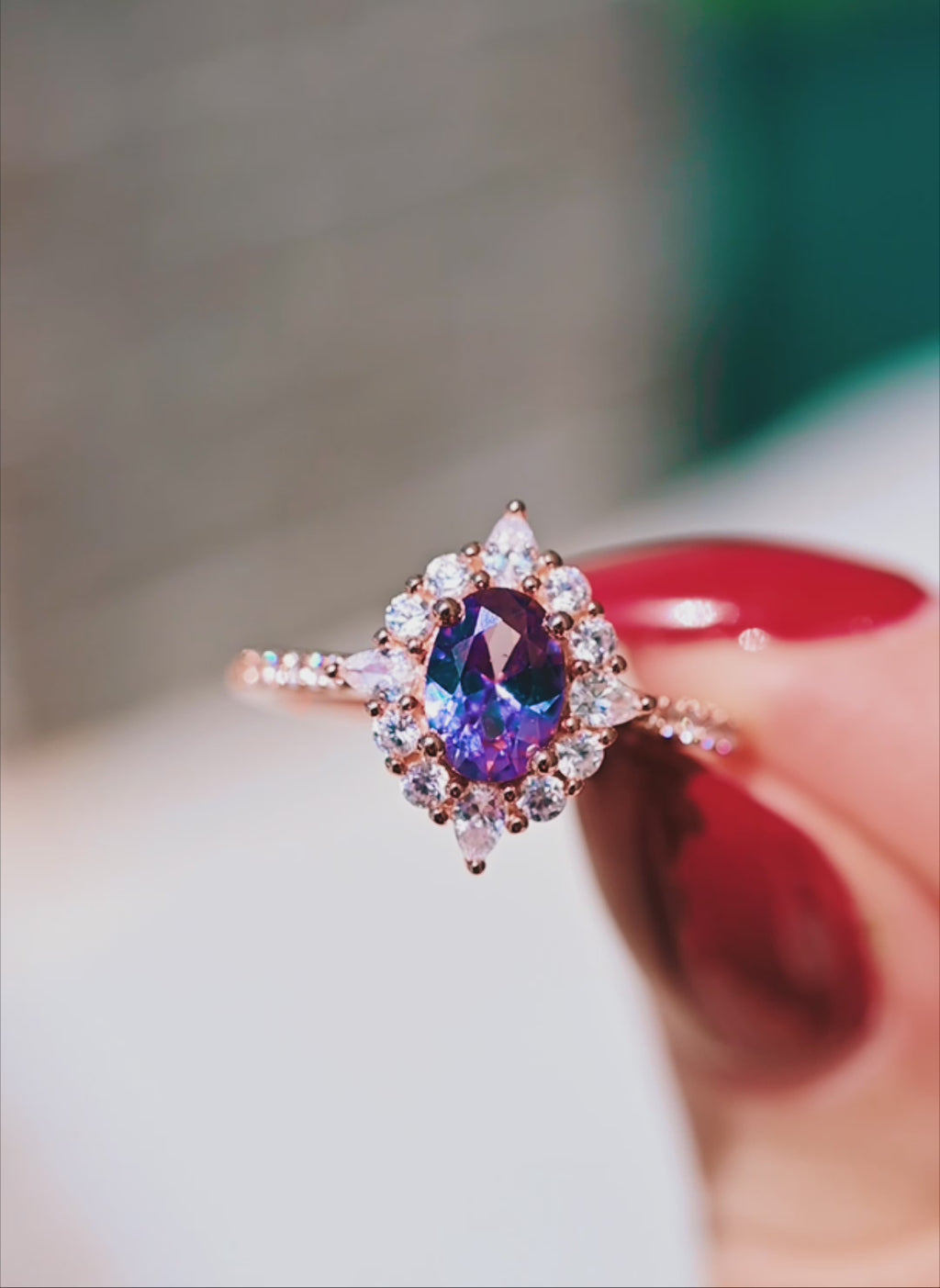 Experience the enchantment of Alexandrite with this Oval Alexandrite Engagement Ring in 14K Rose Gold Vermeil. Designed for those who dream of a ring as unique as their love, this piece makes a perfect engagement ring, promise ring, or anniversary gift.