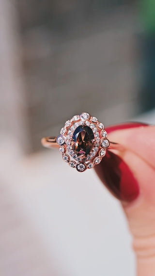 Timeless and elegant, this Vintage Inspired Smoky Quartz Ring features a natural green-brown quartz center stone set in 14K Rose Gold Vermeil over solid 925 Sterling Silver. With its delicate oval cut and shimmering simulated diamond accents, this piece makes a beautiful choice for an engagement ring, promise ring, birthstone ring, or everyday statement piece.
