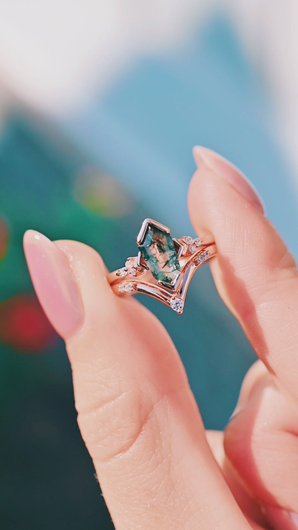 ►The center stone is skillfully accented with a delicate kite-cut green moss agate, enhancing the overall brilliance of the ring and adding a touch of sophistication to its design. The harmonious combination of these natural agate gemstones creates a cohesive and stunning bridal ring set for women, perfect for those seeking a one-of-a-kind engagement or special occasion ring.